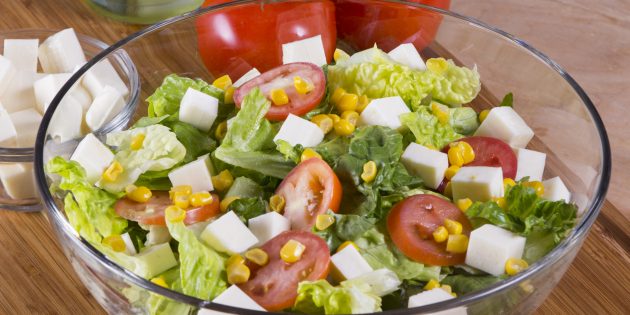 Порежьте помидоры кружочками, а моцареллу — кубиками. Добавьте кукурузу и листья салата. Смешайте уксус, масло, приправы и измельчённый чеснок. Полейте салат заправкой и хорошо перемешайте.