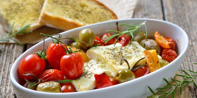 Разломайте фету и хлеб на крупные кусочки. Нарежьте помидоры крупными дольками. Смешайте эти ингредиенты с оливками в глубокой форме для выпекания.