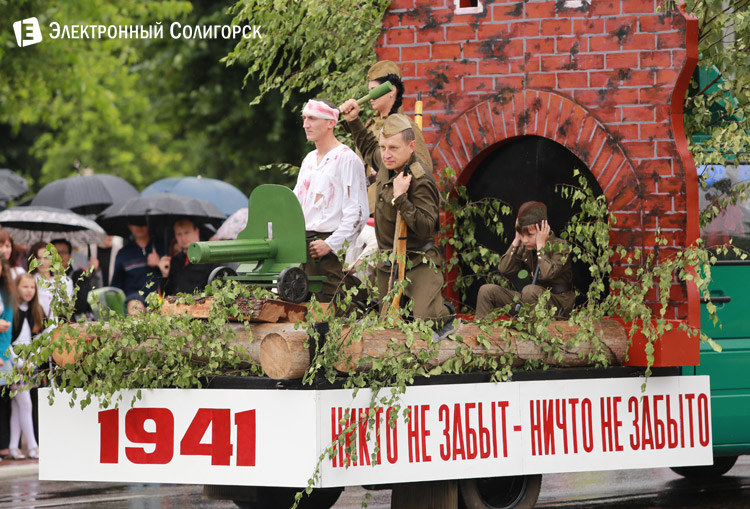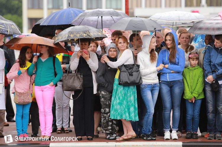 Затем события переместились в центр города. Начавшийся дождь не смог помешать проведению красочного праздничного шествия на улице Ленина. Хотя многим зрителями участникам шествия пришлось вооружиться зонтиками.