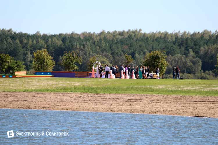 Куда обычно отправляются солигорчане-молодожёны после ЗАГСа? Традиционно у всех новоиспечённых супругов примерно одинаковый маршрут - сначала возложение цветов к одному из мемориалов, затем фотосессия в живописных уголках нашего города и района, ну, и как конечный пункт назначения, ресторан. После завершения благоустройства солигорского Детского пляжа у наших молодожёнов появился ещё один вариант, куда можно отправиться, выйдя из Дворца бракосочетаний: говорят, на автостоянке близ водохранилища в последнее время всё чаще можно наблюдать свадебные кортежи. Вот и корреспонденту "Электронного Солигорска" случайным образом посчастливилось стать свидетелем праздника под открытым небом. Молодожёны принимали поздравления от немногочисленных гостей прямо на берегу водоёма. Место проведения торжества оформлено соответственно случаю.
