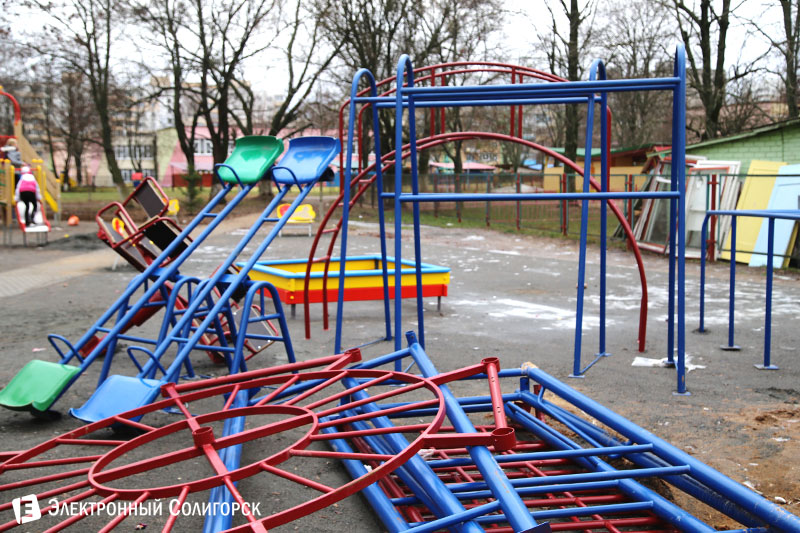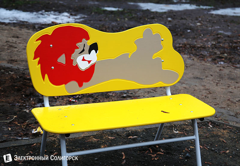 Судя по количеству конструкций, которые пока еще не установлены, но уже привезены сюда, новая площадка будет одной из самых масштабных в городе. Здесь есть и горки, и лесенки, и турники, и песочница, и качели разных видов. Особый колорит в облик площадки вносят яркие скамейки с изображением Львенка - известного персонажа из мультфильма.