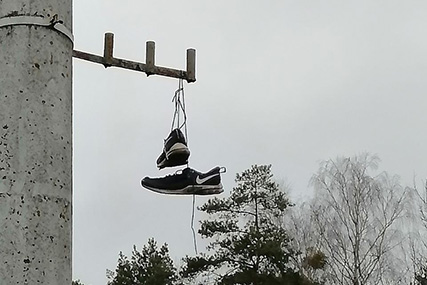 Фотофакт. В Солигорске зачем-то забрасывают обувь на столбы и деревья