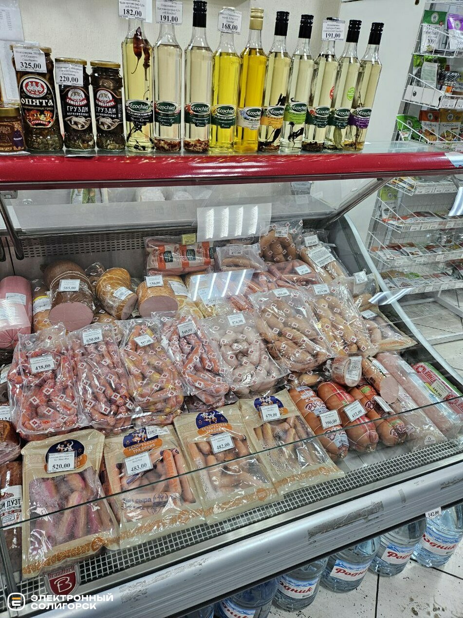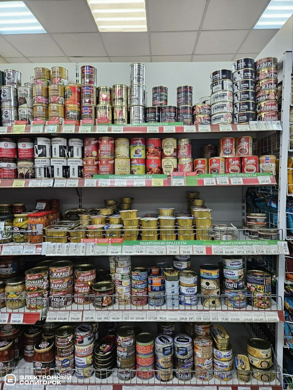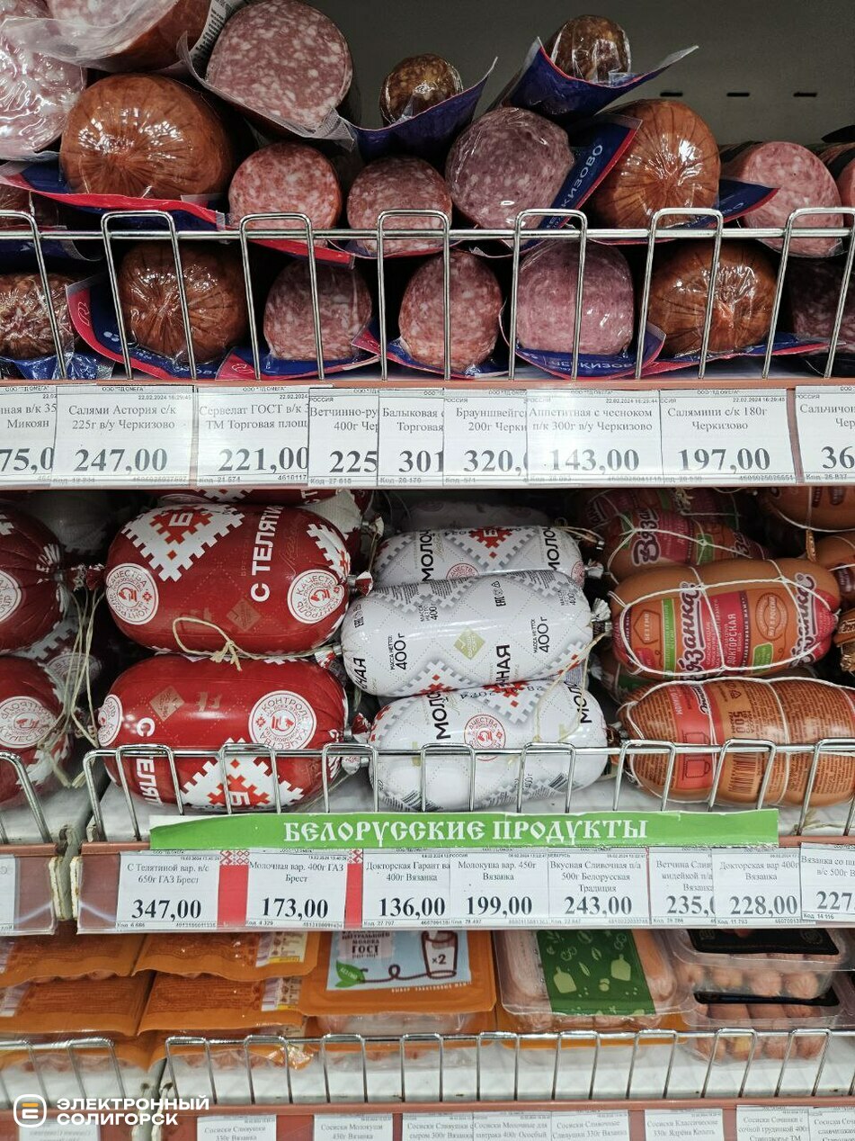Салями, сервелат и колбасы можно приобрести в диапазоне цен: 173–320 рублей (6–11 BYN), сосиски – 438–620 (15–21 BYN), тушёнка – 158–224 рубля (5.50–7.80 BYN).