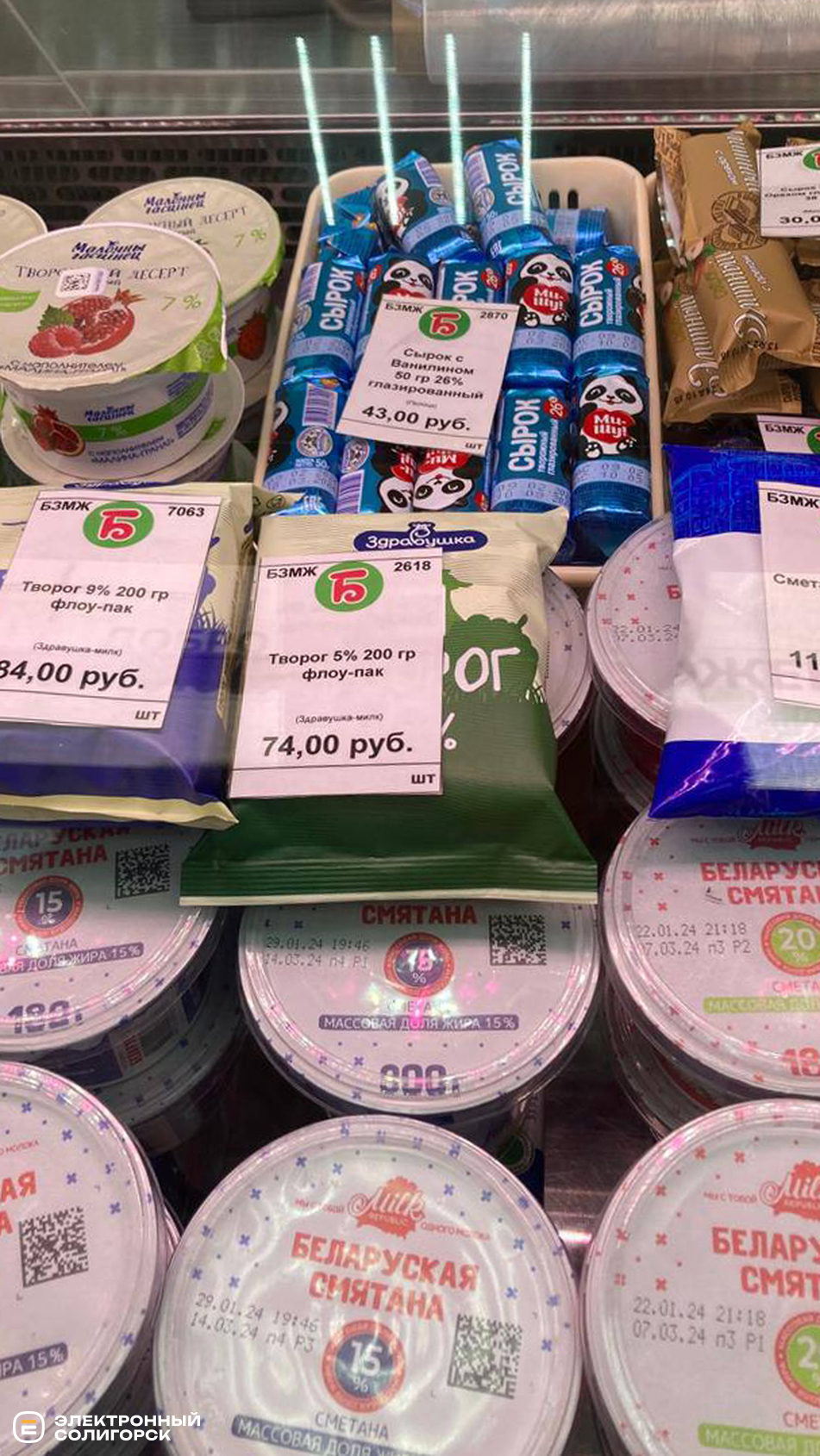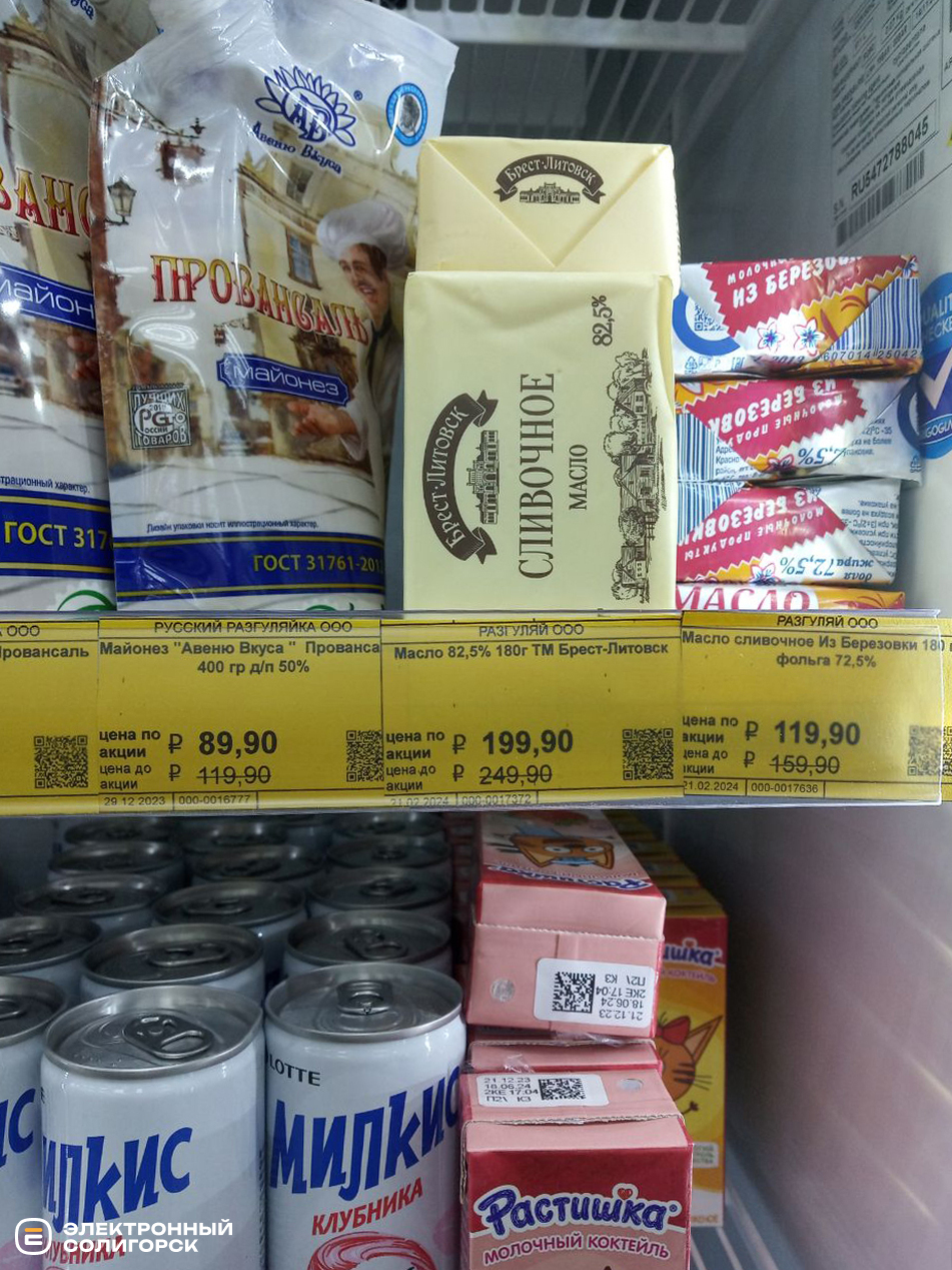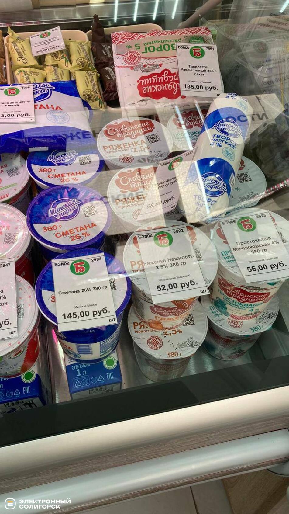 Творог мягкий – 120 рублей (4 BYN), творог на акции – 120–300 рублей (4–10 BYN), сметана 15% – 96 рублей (3.35), сыры фасованные – 180–210 рублей (6.30–7.30 BYN), творожки с фруктовыми наполнителями – 56–79 рублей (1.95–2.79 BYN), сливочное масло – 210–450 рублей (7.30 –15 BYN), лидский квас – 120 рублей (4.19 BYN).
