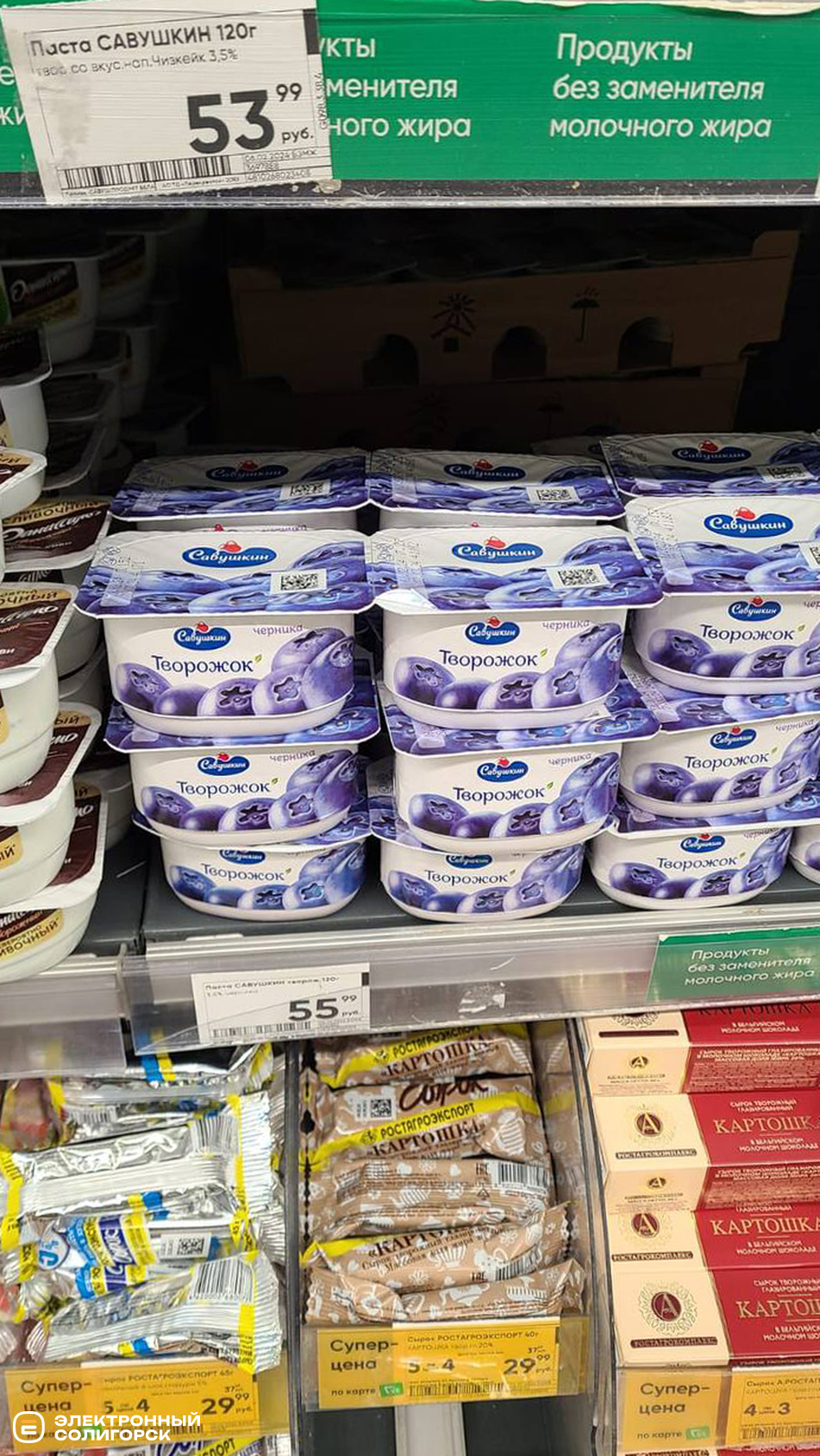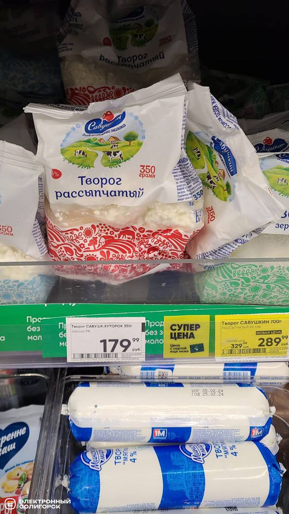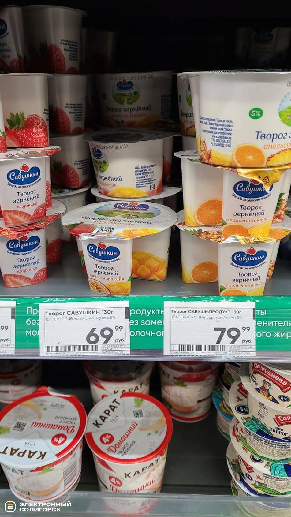 Творог мягкий – 120 рублей (4 BYN), творог на акции – 120–300 рублей (4–10 BYN), сметана 15% – 96 рублей (3.35), сыры фасованные – 180–210 рублей (6.30–7.30 BYN), творожки с фруктовыми наполнителями – 56–79 рублей (1.95–2.79 BYN), сливочное масло – 210–450 рублей (7.30 –15 BYN), лидский квас – 120 рублей (4.19 BYN).