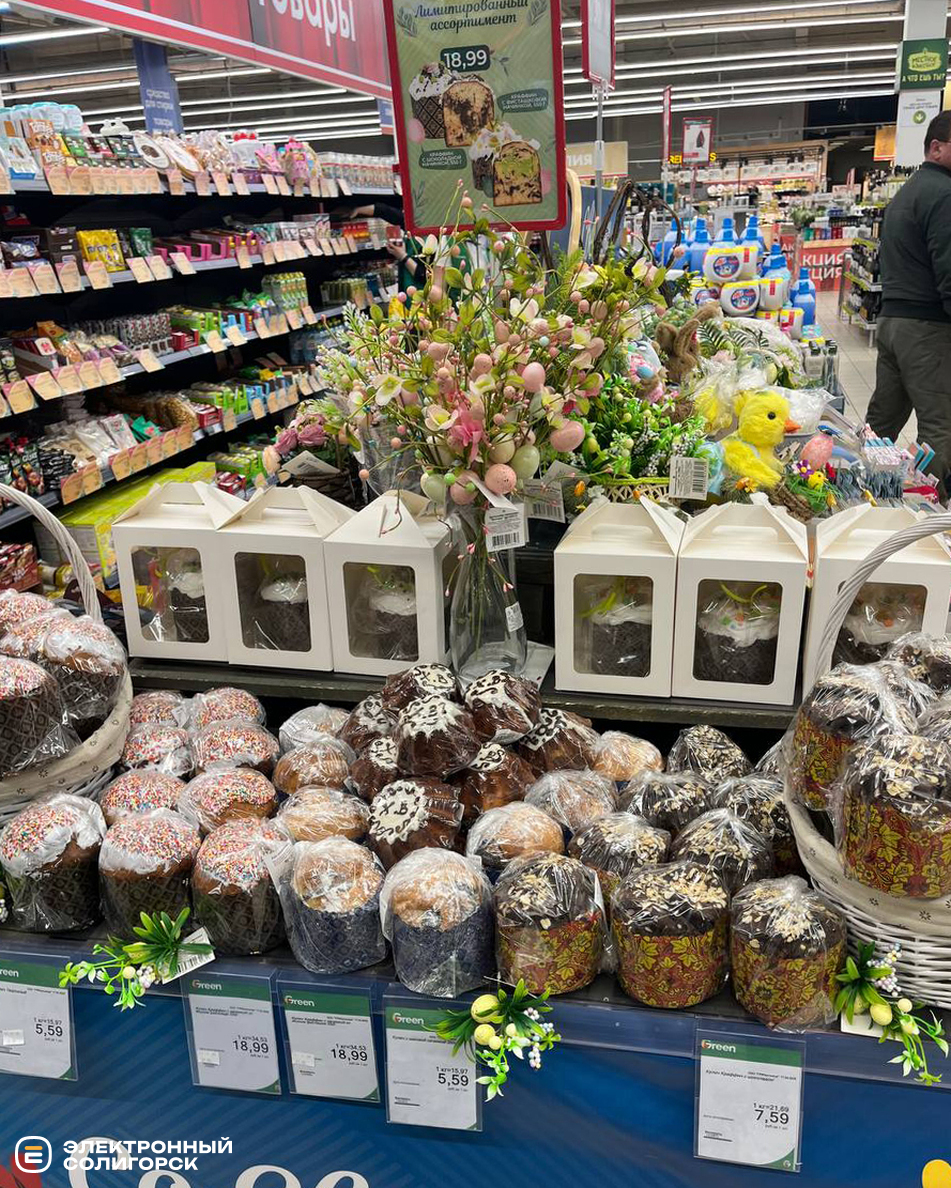 Заглянули в магазин "Грин". Здесь выбор весьма разнообразный - продают от маленького кулича "для одного" за 5,59 руб. до большого и сладкого в коробке за 18,99 руб.