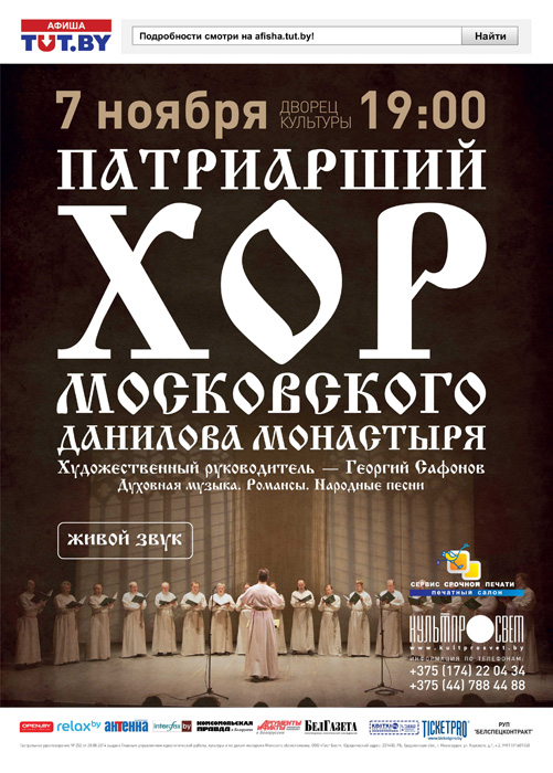 В рамках юбилейного тура по городам Беларуси Патриарший хор Московского Данилова монастыря выступит в Солигорске. Концерт известного коллектива в нашем городе состоится 7 ноября в 19.00 во Дворце культуры.