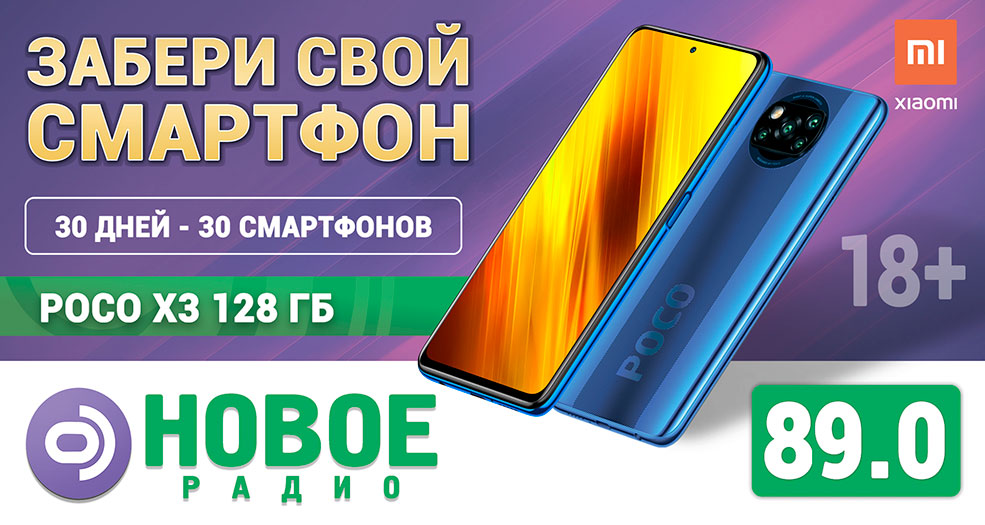 Весь ноябрь Новое радио и Xiaomi дарят 30 бомбических Xiaomi POCO X3. В этом смартфоне прекрасно всё: от экрана 120 Гц, стереозвука, стильного дизайна, отличной камеры на 64 МП, мощного аккумулятора и процессора до самой важной характеристики: он может достаться тебе бесплатно.