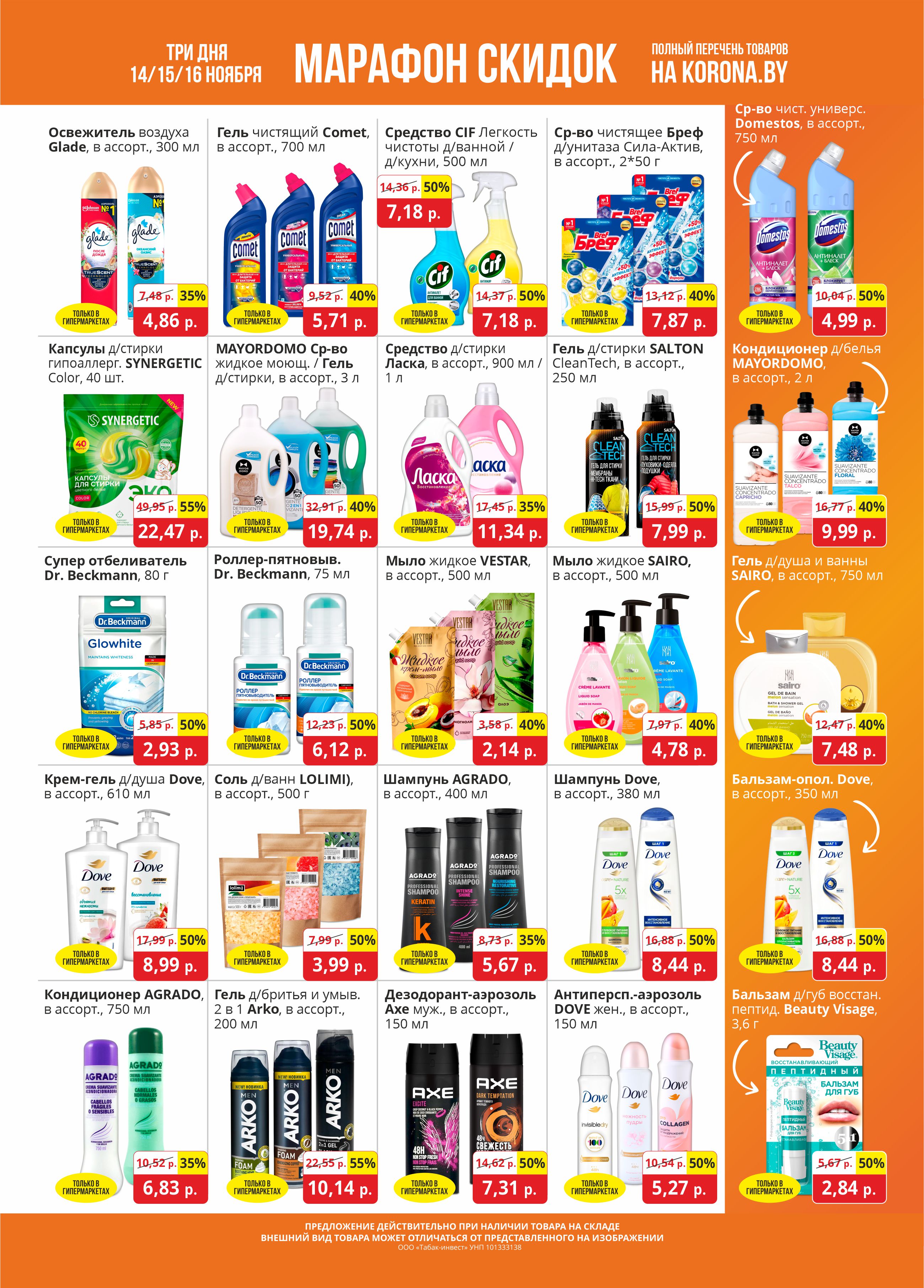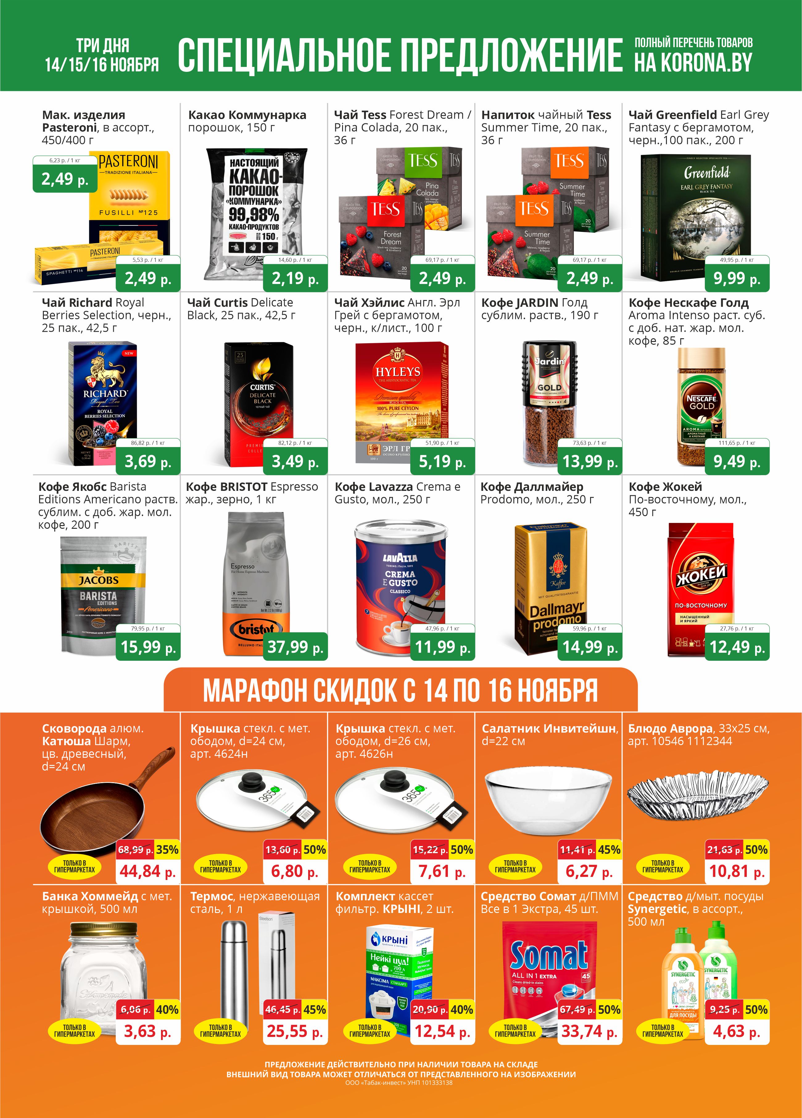Только 14/15/16 ноября успейте приобрести продукты, косметику, бытовую химию, посуду, домашний текстиль, автотовары и многое другое со скидками до пятидесяти процентов!
