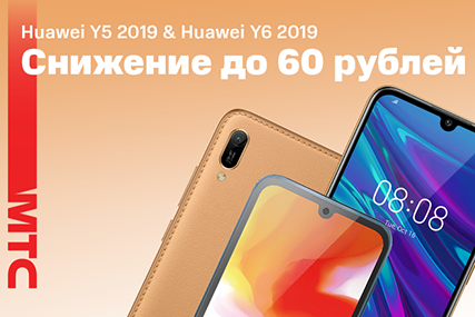Популярные бюджетные смартфоны Huawei стали в МТС еще доступнее! Теперь при покупке Huawei Y5 2019 единым платежом можно сэкономить почти четверть от его стоимости, а приобретение Huawei Y6 2019 таким же способом позволит сэкономить около 50 рублей.