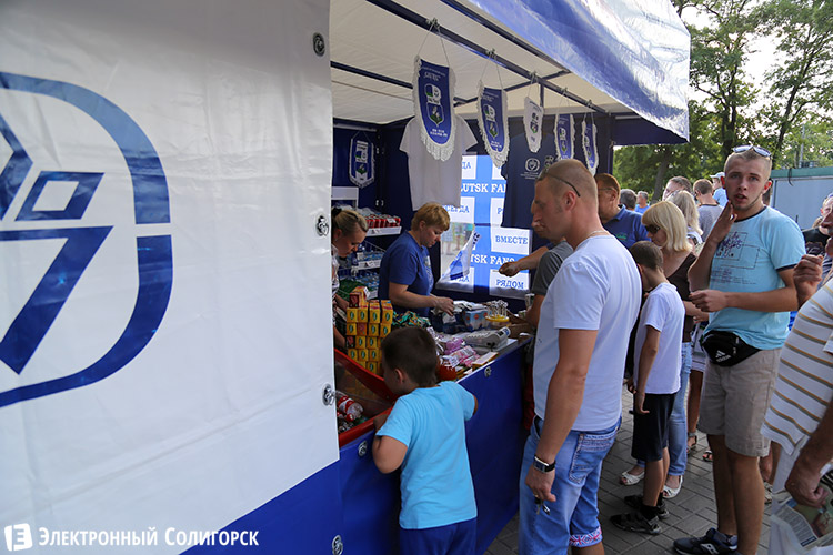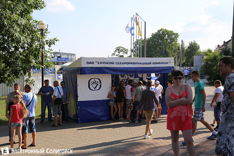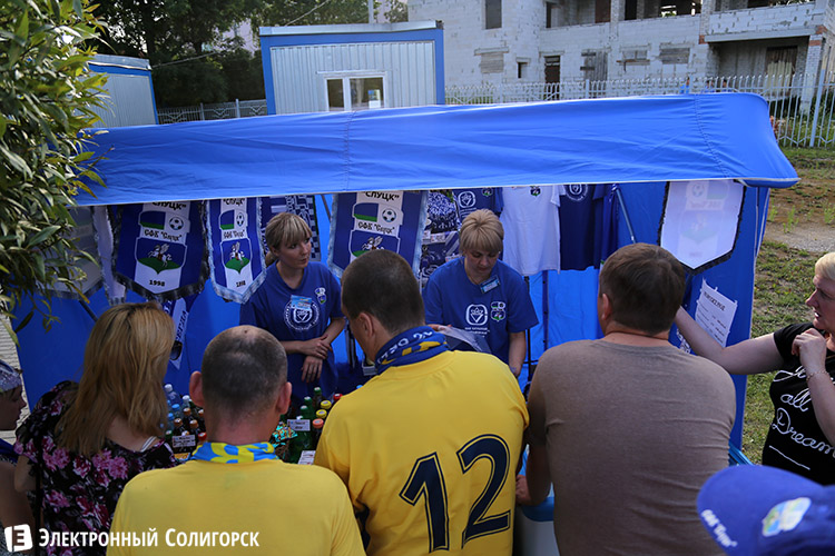 За оградой стадиона была замечена палатка, где был представлен довольно широкий ассортимент мерчендайза слуцкой команды, продаваемый вперемешку с прохладительными напитками, чипсами и мороженым.