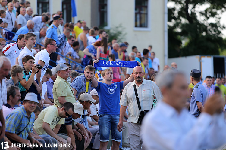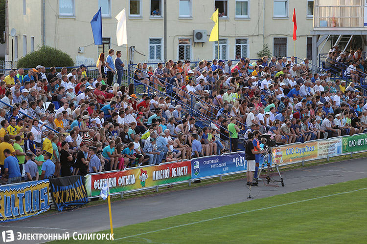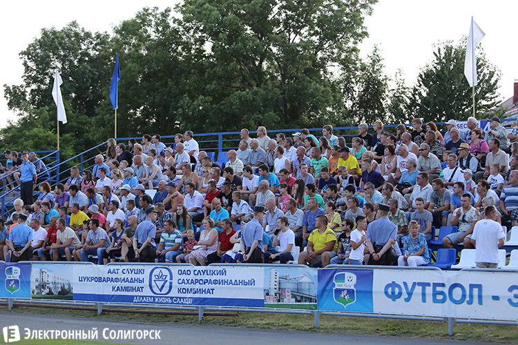 Вы не знаете, как болеют в Слуцке? О, это делают поистине уникально. На трибунах можно было набюдать ядреный коктейль из орущих баянистые шутки (например, "уноси симулянта") мужичков-кузьмичей, дующих в дудки нескольких дядек-заводил, азартно топающих вместе со всеми ногами женщин бальзаковского возраста, с огоньком в глазах наблюдающих количество юных девушек, пришедших на стадион парами и целыми семьями людей разного возраста, добавьте к этому сектора с фанатами команд, активно заряжающих кричалки и машущих флагами. Получается, весьма колоритный антураж, особенно, если учесть непосредственную близость трибун к полю и возможность полного эмоционального погружения в события игры.
