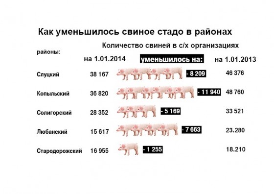 Сколько свиней пришлось уничтожить жителям региона, доподлинно неизвестно и вряд ли будет подсчитано. А вот Национальный статистический комитет подсчитал, что в сельхозорганизациях нашего региона количество животных уменьшилось на 34 236 голов (по состоянию на 1 января 2014 года). Больше всего свиней «потерял» Копыльский район – 11 940 голов (см. график).