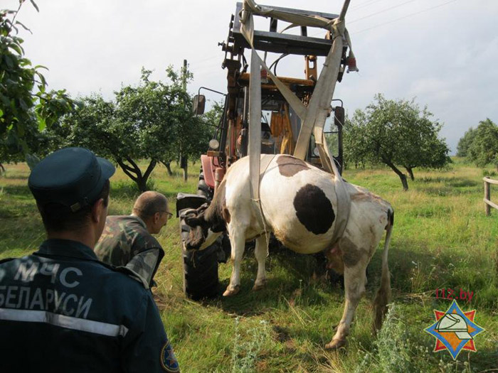 Работниками МЧС совместно с работниками ОАО "Чырвоная змена" при помощи рукавов для хозяйственных нужд и трактора погрузчика "Амкадор" корова была извлечена из колодца.
