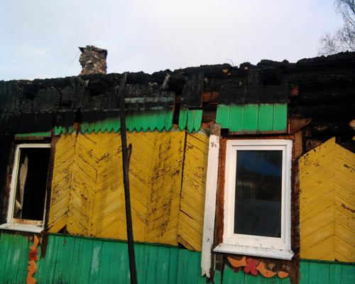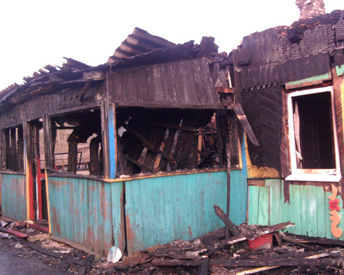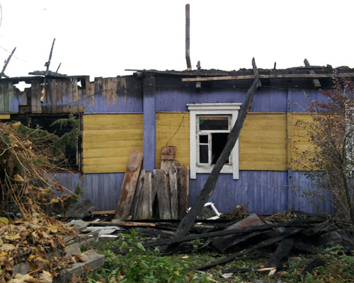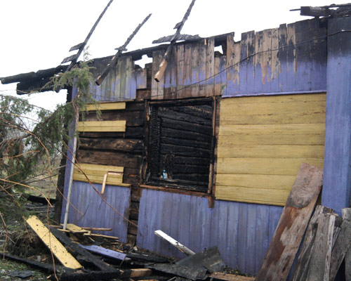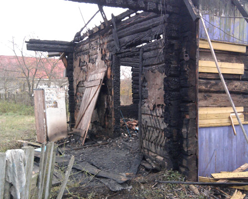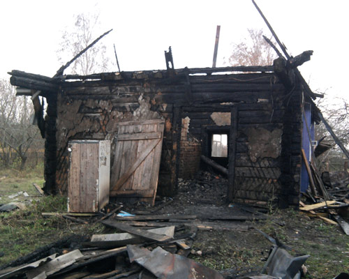 В результате пожара уничтожена кровля по всей площади, выгорела комната 6х4м, обрушилось перекрытие; комната 6х6м закопчена. Сарай уничтожен полностью.
