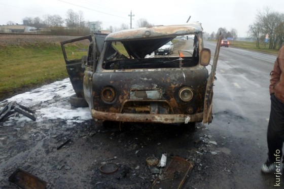 «Кур'еру» в Слуцком РОЧС сообщили, что возгорание автомобиля УАЗа произошло во время движения автомобиля в районе ж/д переезда на окраине Слуцка. Загорание началось в моторном отсеке и в течение считанных минут пламя распространилось по автомобилю. В УАЗе была газовая установка. Также в салоне авто перевозили два баллона с кислородом и два баллона с газом, которые водитель успел вытащить. А вот баллон из газовой установки из-за разбушевавшегося пламени достать уже не удалось.