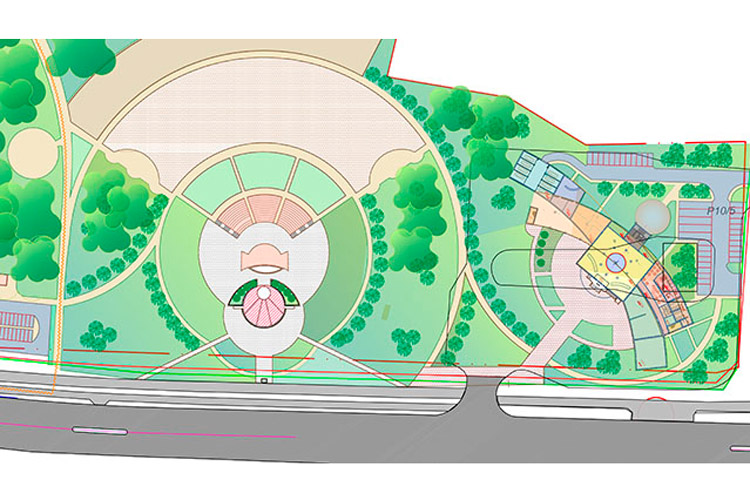 Объект украсят цветы и кустарники. Так, в центральном проходе предусмотрены пять клумб. По радиусу цветочниц на верхнем уровне высадят 16 туй, а вокруг самой площадки – барбарис.