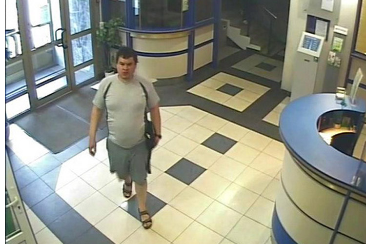 Приметы мужчины: на вид 33-36 лет, рост 175-178 см, плотного телосложения, волосы средней длины, брюнет. Был одет в светло-серую фуфайку (майку) с коротким рукавом, серые шорты ниже колена с черными лампасами, сандалии. На плече имел черную кожаную сумку на длинном ремне.