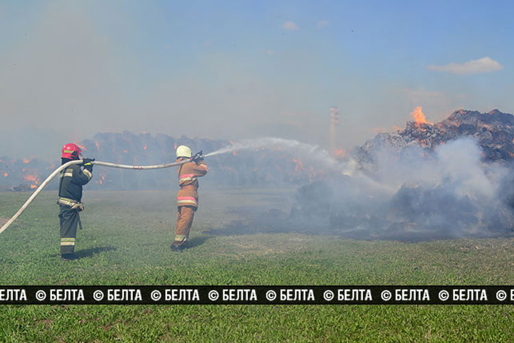 По оперативной информации, возгорание произошло около 12 часов дня. Причиной пожара мог стать поджог одного из стогов с прессованной соломой.