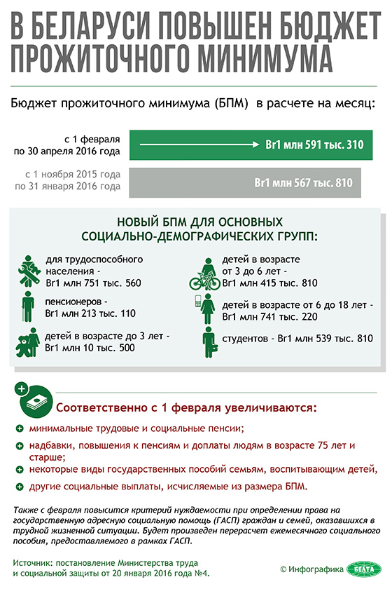 Бюджет прожиточного минимума (БПМ) с 1 февраля по 30 апреля 2016 года в расчете на месяц составляет Br1 млн 591 тыс. 310 (с 1 ноября 2015 года по 31 января 2016 года БПМ составлял Br1 млн 567 тыс. 810).