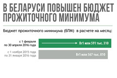 Бюджет прожиточного минимума (БПМ) с 1 февраля по 30 апреля 2016 года в расчете на месяц составляет Br1 млн 591 тыс. 310 (с 1 ноября 2015 года по 31 января 2016 года БПМ составлял Br1 млн 567 тыс. 810).