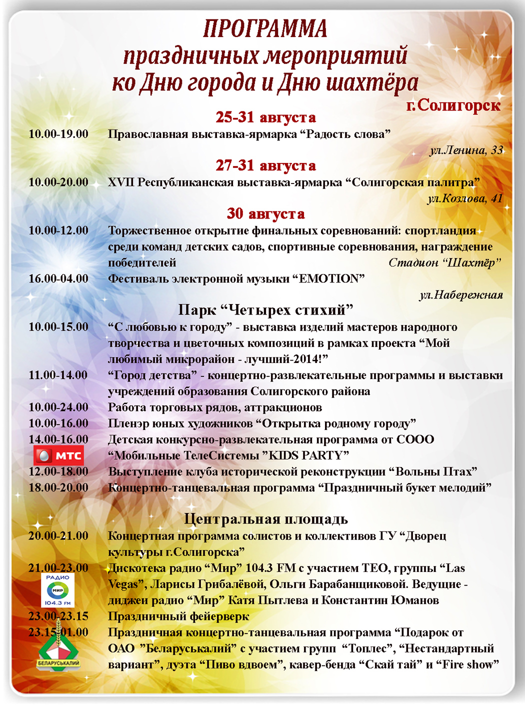Сегодня Солигорск празднует свой 56-й День рождения Предлагаем вашему вниманию подробную афишу праздничных мероприятий, которые проходят сегодня в городе в честь праздника.