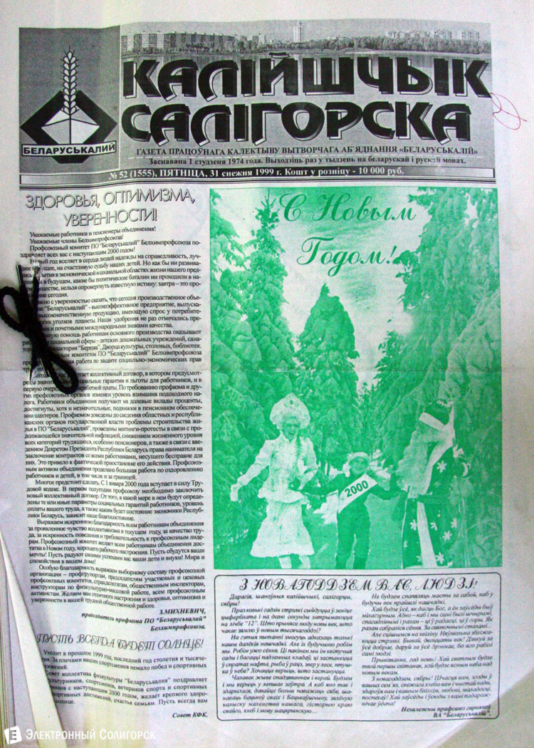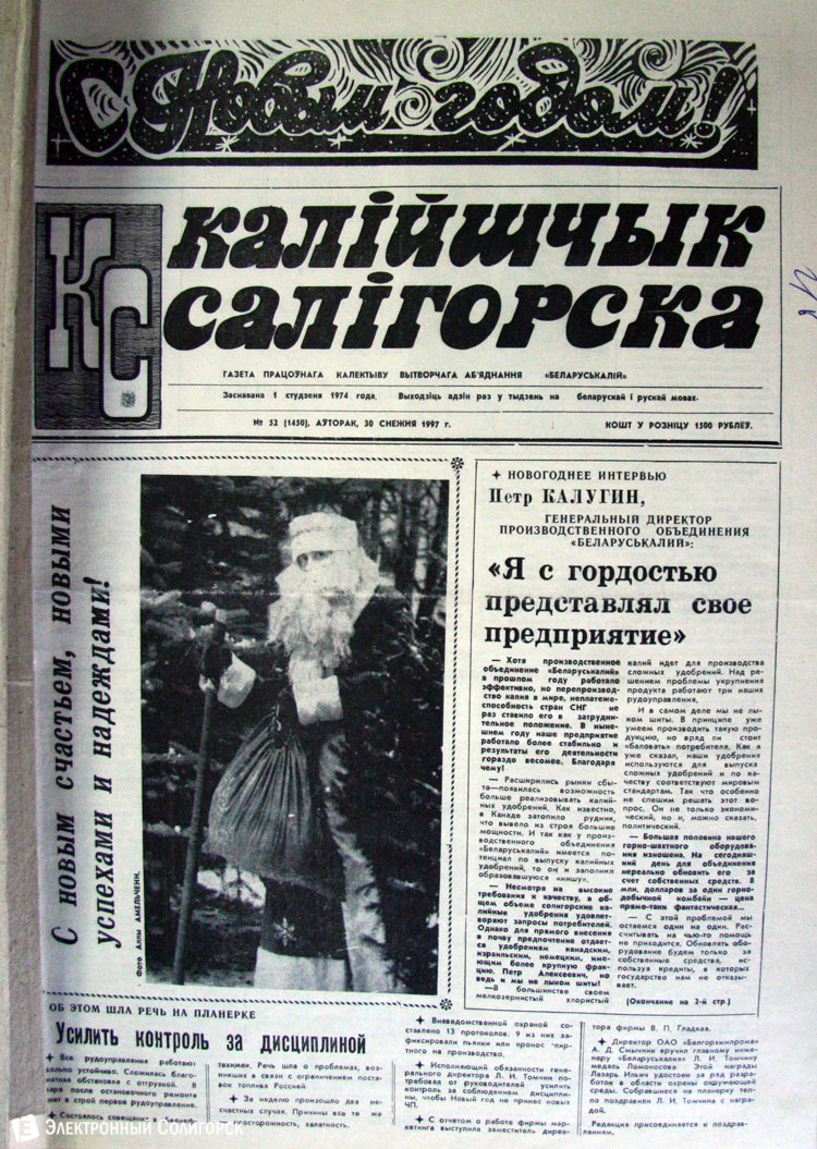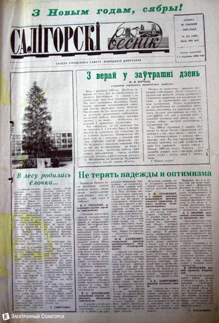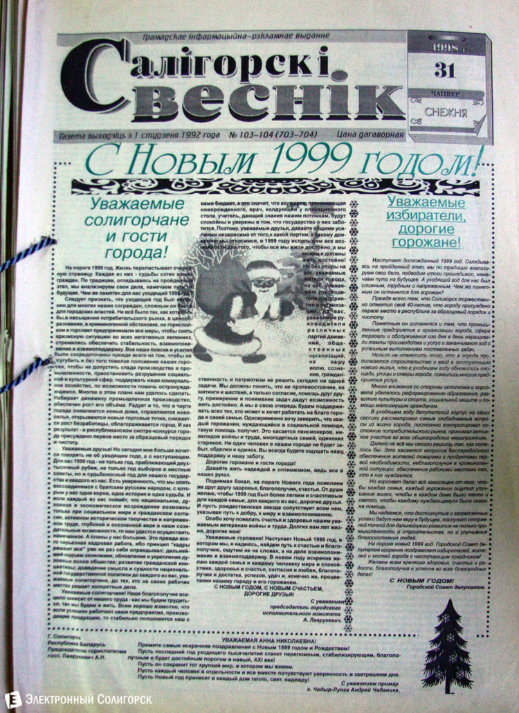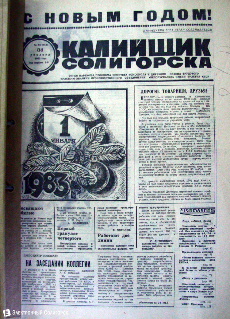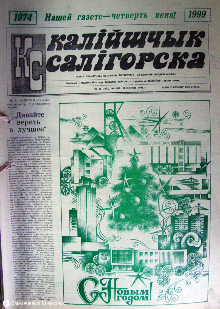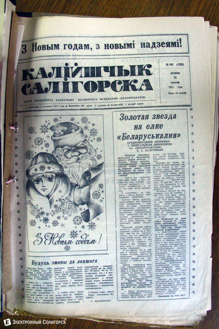 Разглядывая газетные страницы прошлого века можно найти немало интересного из истории города: поздравления с Новым годом от таких градоначальников, как Николай Юрчик и Анна Лаврукевич, напутственные слова труженикам калийного объединения от генерального директора «Беларуськалия» Петра Калугина или датированные аж рубежом 80-го и 81-го годов новогодние пожелания от нынешнего гендиректора «Стройтреста № 3» Николая Ашейчика.