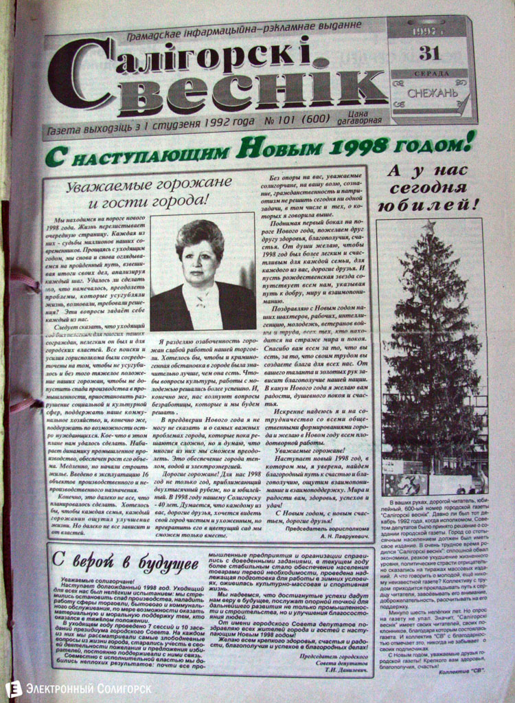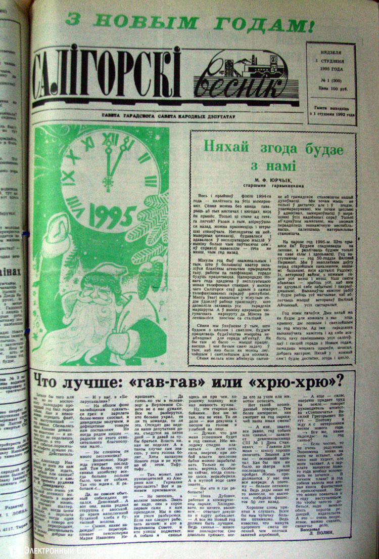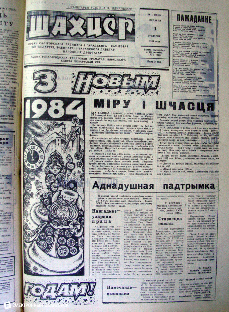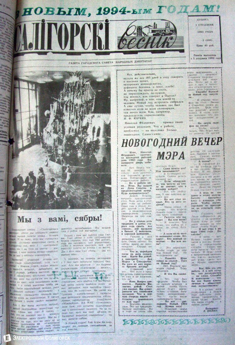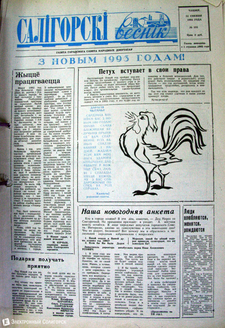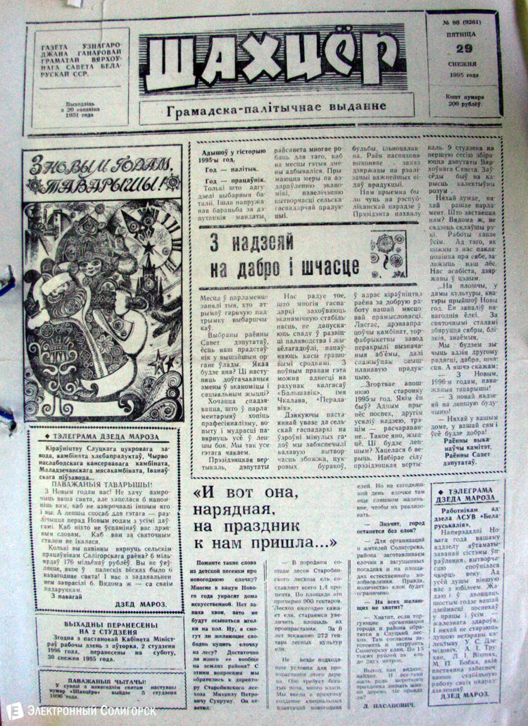 Разглядывая газетные страницы прошлого века можно найти немало интересного из истории города: поздравления с Новым годом от таких градоначальников, как Николай Юрчик и Анна Лаврукевич, напутственные слова труженикам калийного объединения от генерального директора «Беларуськалия» Петра Калугина или датированные аж рубежом 80-го и 81-го годов новогодние пожелания от нынешнего гендиректора «Стройтреста № 3» Николая Ашейчика.