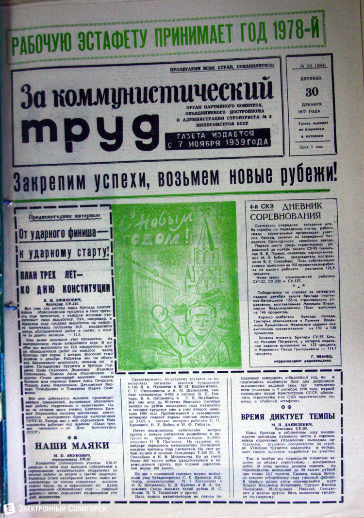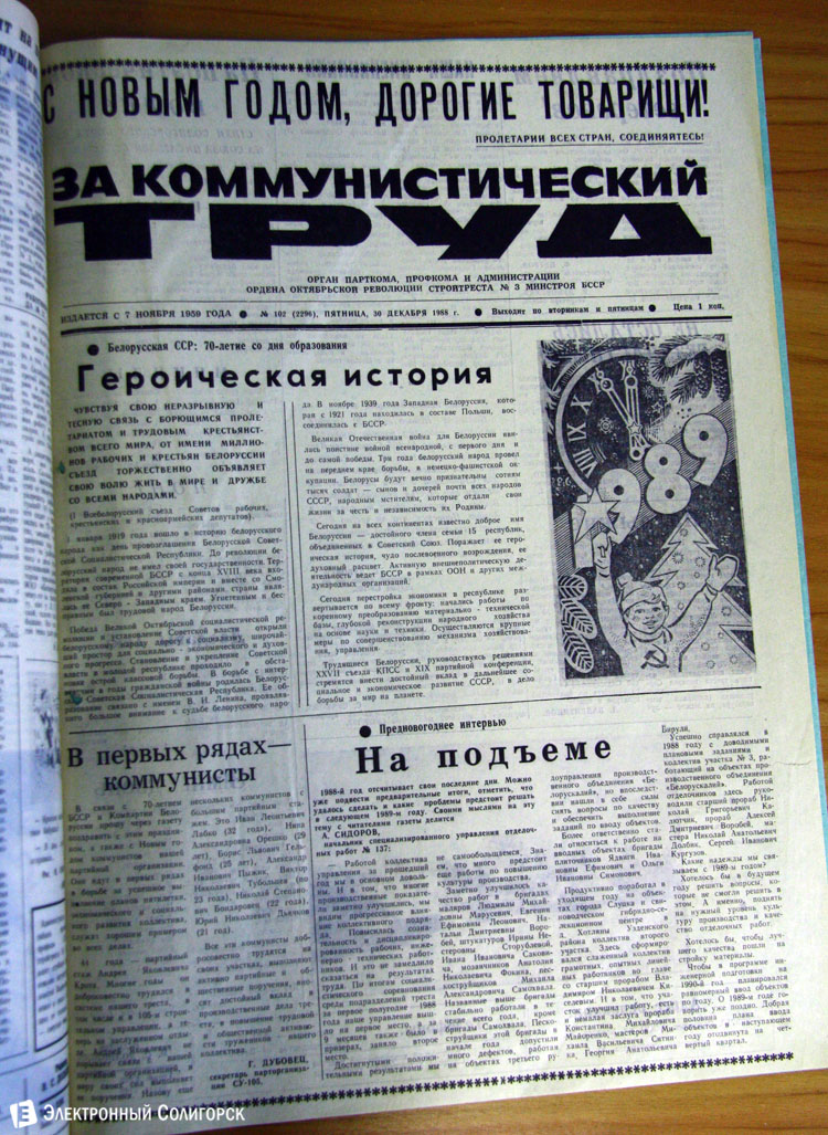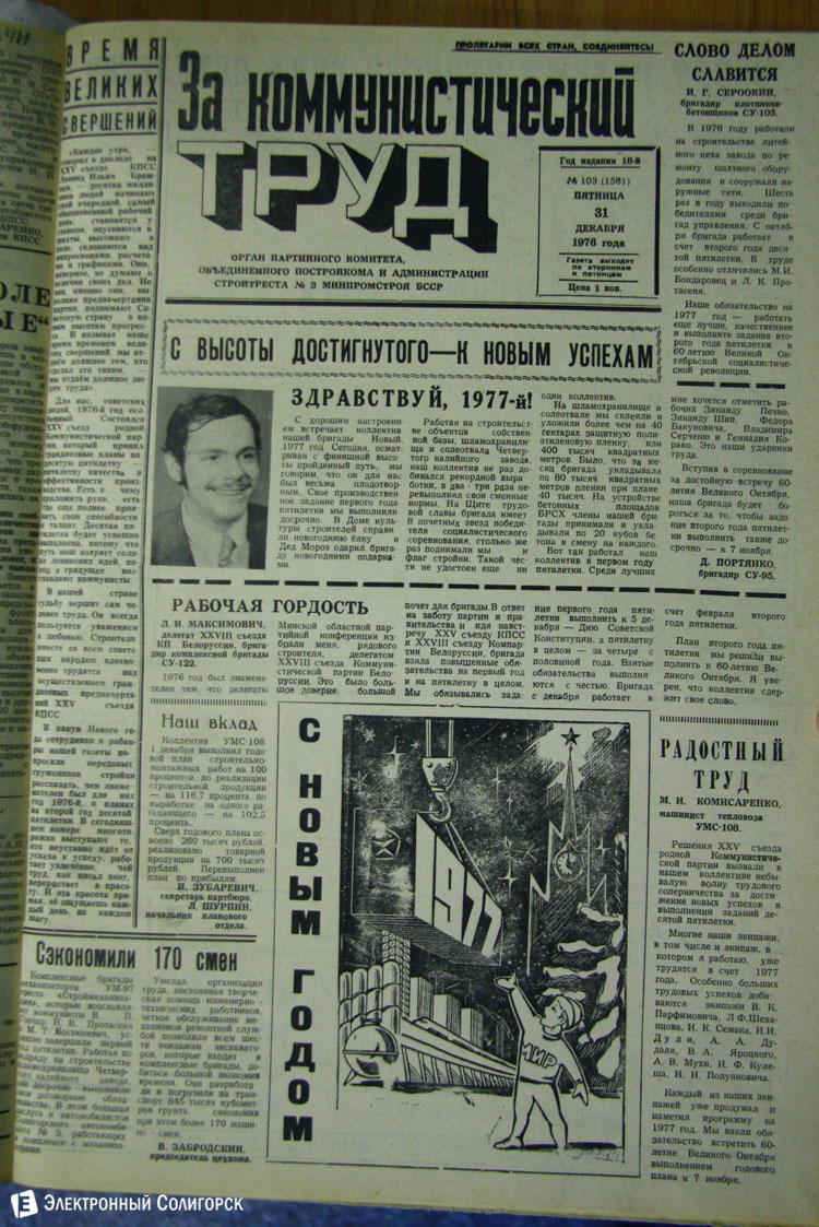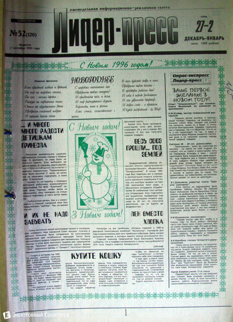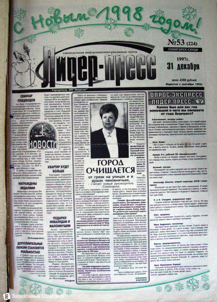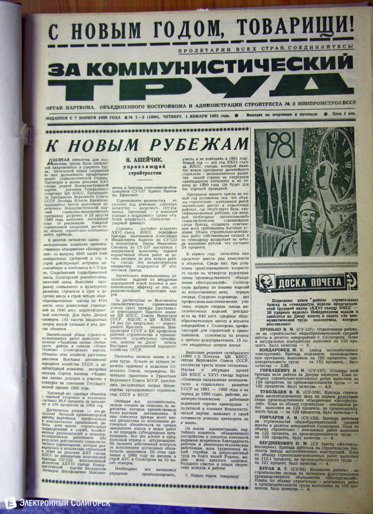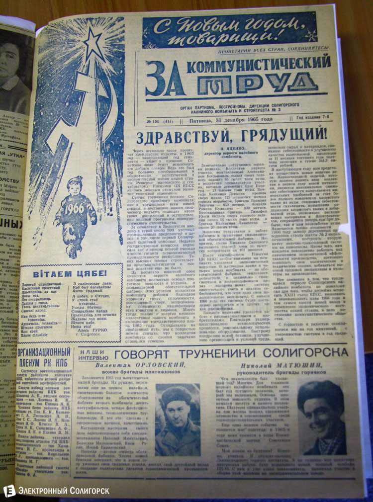 Разглядывая газетные страницы прошлого века можно найти немало интересного из истории города: поздравления с Новым годом от таких градоначальников, как Николай Юрчик и Анна Лаврукевич, напутственные слова труженикам калийного объединения от генерального директора «Беларуськалия» Петра Калугина или датированные аж рубежом 80-го и 81-го годов новогодние пожелания от нынешнего гендиректора «Стройтреста № 3» Николая Ашейчика.