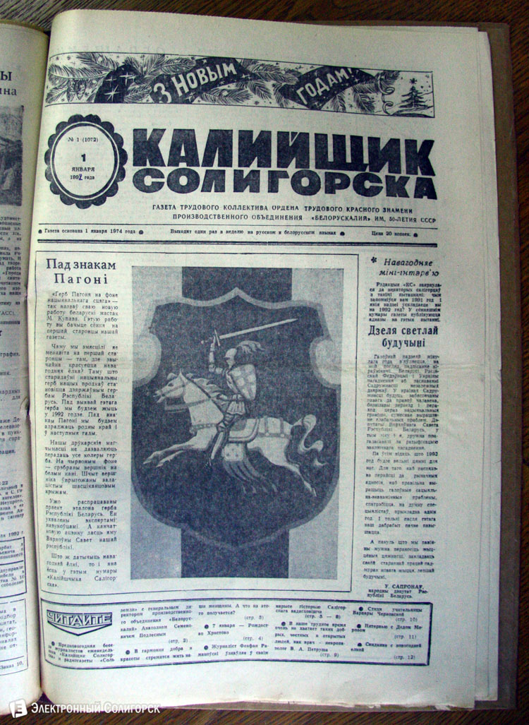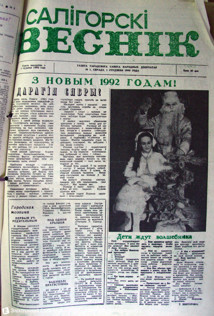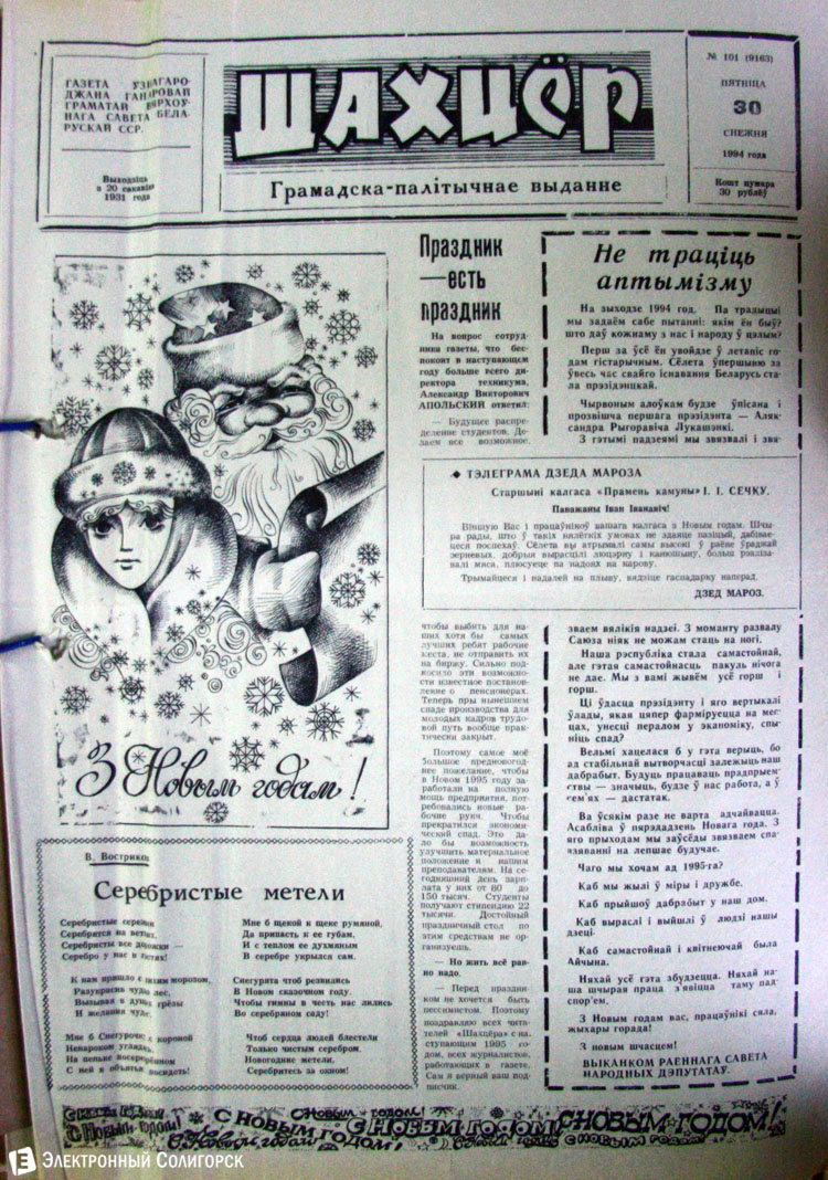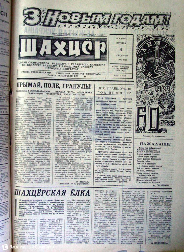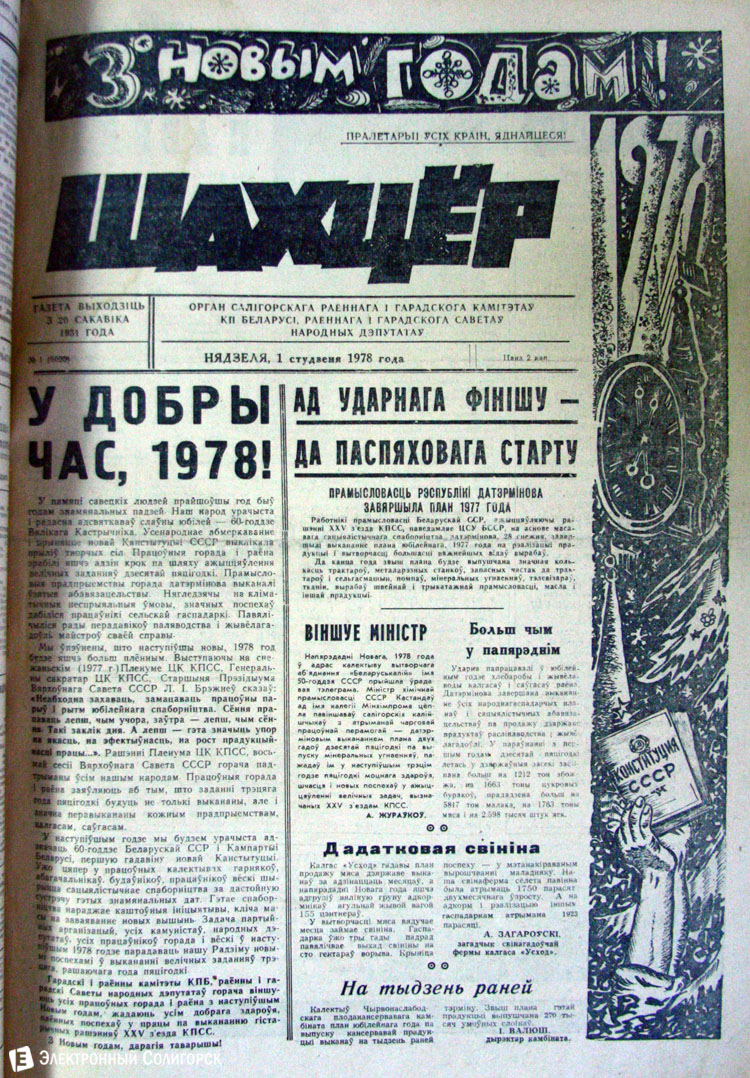 «Электронный Солигорск» основательно проштудировал архивные подшивки печатных изданий Солигорска прошлого века, начиная с 1962 года, и отобрал 50 наиболее примечательных первых страниц новогодних и рождественских выпусков. Вы сможете увидеть, какими были новогодние передовицы первой солигорской газеты «За коммунистический труд», ставшей предшественником нынешнего «Строителя Солигорска», как поздравляли своих читателей «Шахцер», «Калийщик Солигорска», «Лидер-пресс» и канувший в Лету «Салiгорскi веснiк».
