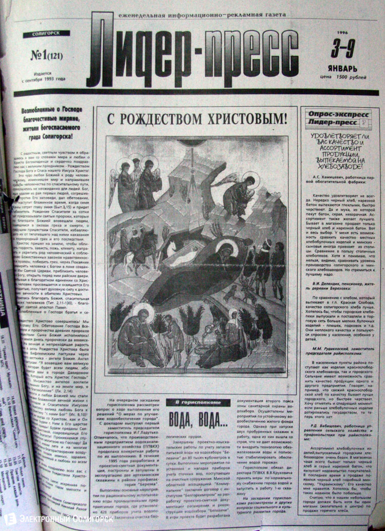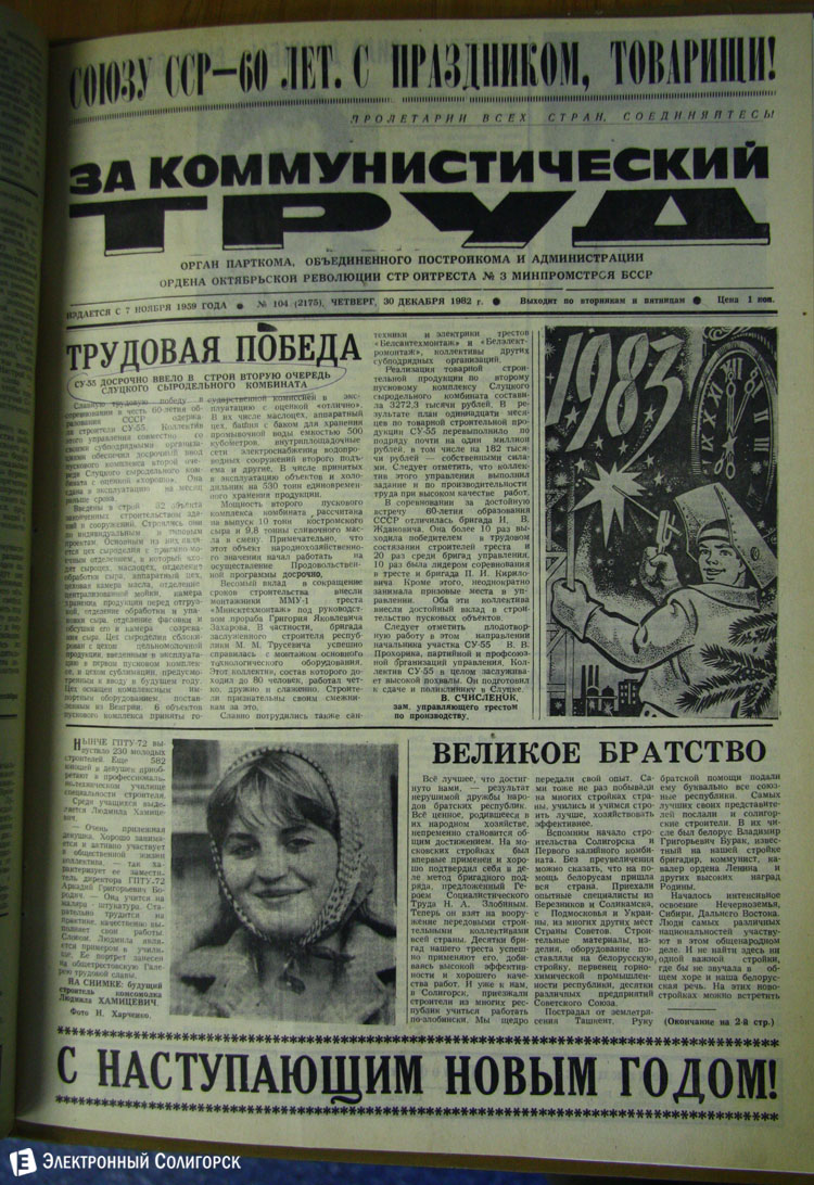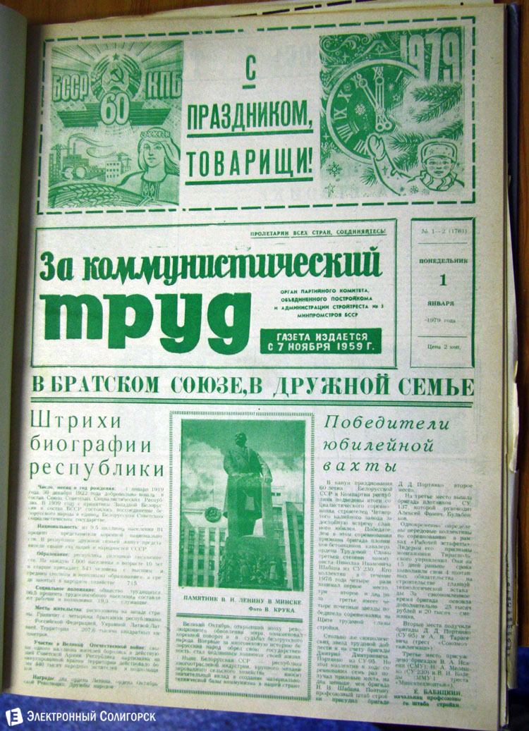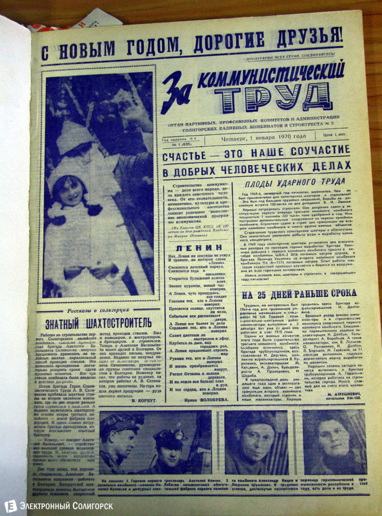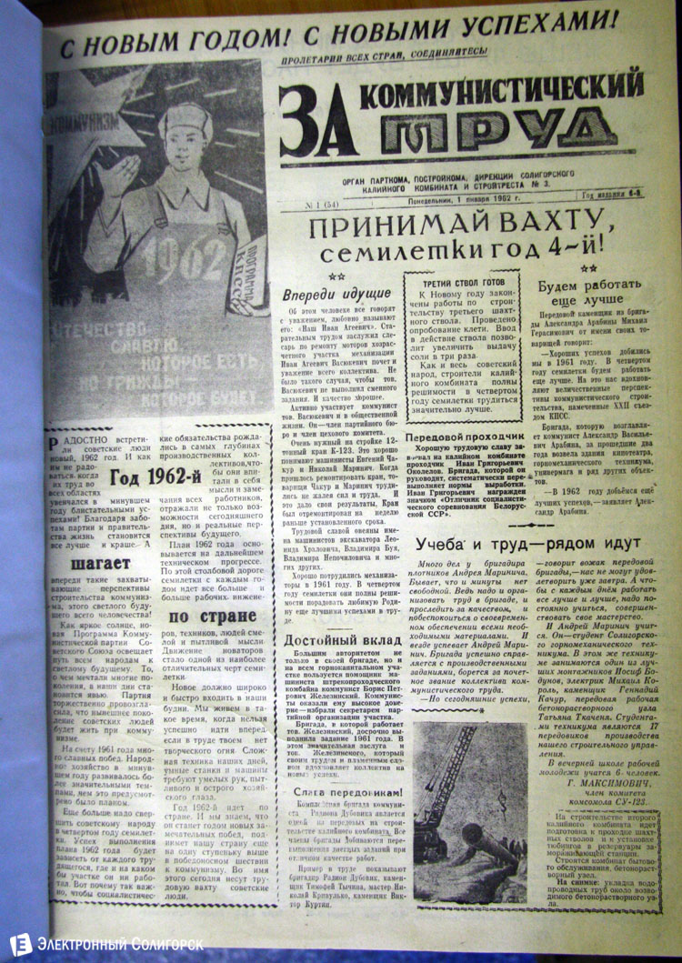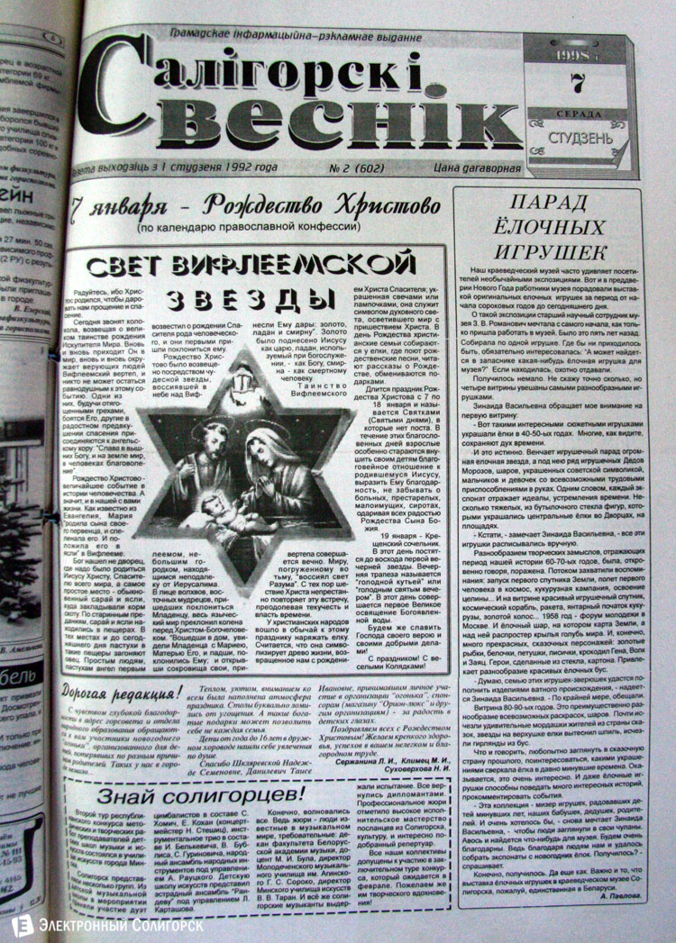 «Электронный Солигорск» основательно проштудировал архивные подшивки печатных изданий Солигорска прошлого века, начиная с 1962 года, и отобрал 50 наиболее примечательных первых страниц новогодних и рождественских выпусков. Вы сможете увидеть, какими были новогодние передовицы первой солигорской газеты «За коммунистический труд», ставшей предшественником нынешнего «Строителя Солигорска», как поздравляли своих читателей «Шахцер», «Калийщик Солигорска», «Лидер-пресс» и канувший в Лету «Салiгорскi веснiк».
