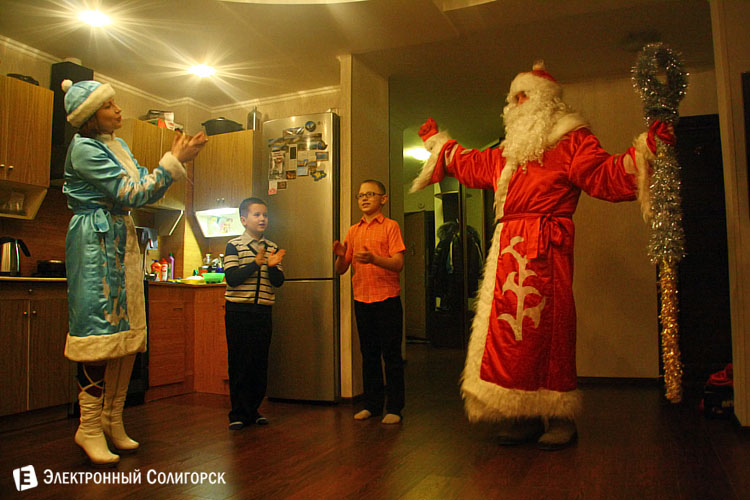 В этот момент дружным хором дети - Никита, Павел и Миша - зовут Снегурочку и она уходит веселить их в пару к Деду Морозу. Конкурсы, стихи, хороводы - обо все этом лучше всего расскажут фото, которые и призваны передать праздничное настроение.
