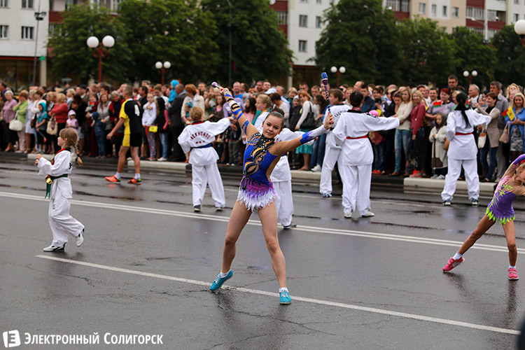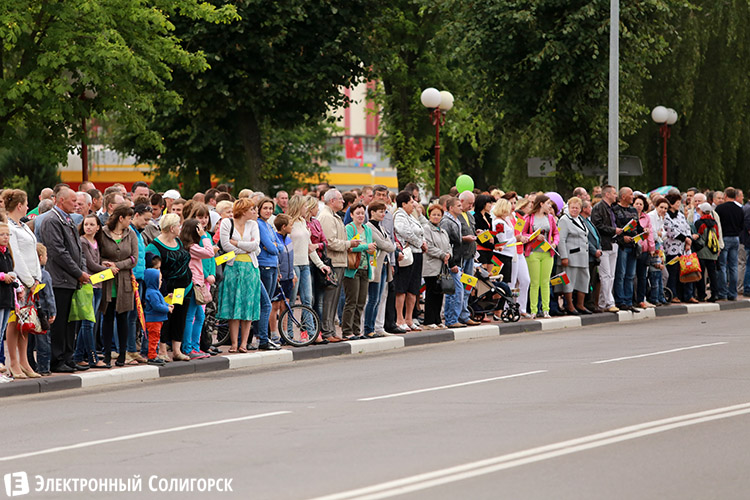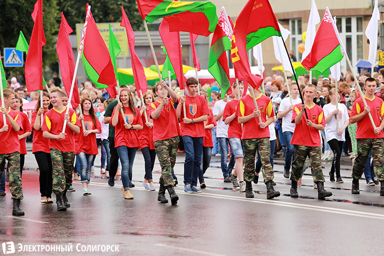 Вторая часть шествия - представление современных достижений Беларуси и Солигорского района. В праздничных колоннах прошли солигорские молодые семьи, лучшие из представителей молодежи - победители и призеры учебных олимпиад, творческих конкурсов, спортивных соревнований, представители общественных объединений.