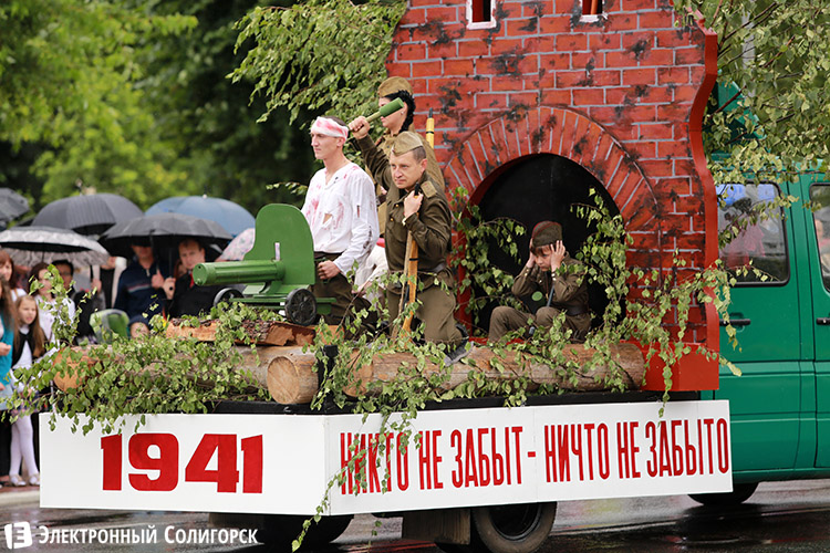 В ходе тематического театрализованного представления с участием передвижных декорация и хореографических коллективов была своеобразно продемонстрирована хроника военных событий середины прошлого века: от нападения на Советский Союз немецких войск до освобождения Беларуси. Минутой молчания была почтена память всех, кто отдал свою жизнь во время военного лихолетья.