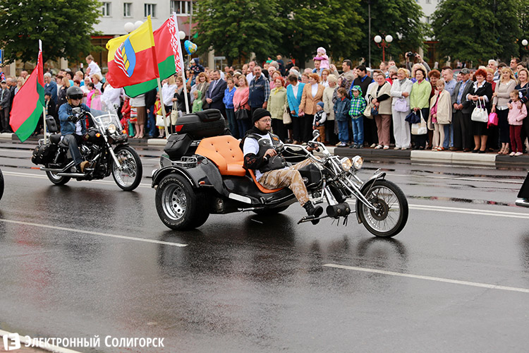 Замыкали праздничное шествие громкой и зрелищной колонной современные рыцари на железных конях - солигорские байкеры.