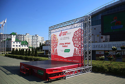 Фотофакт. Возле спортивно-зрелищного комплекса устанавливают конструкции для старта эстафеты "Пламя мира"