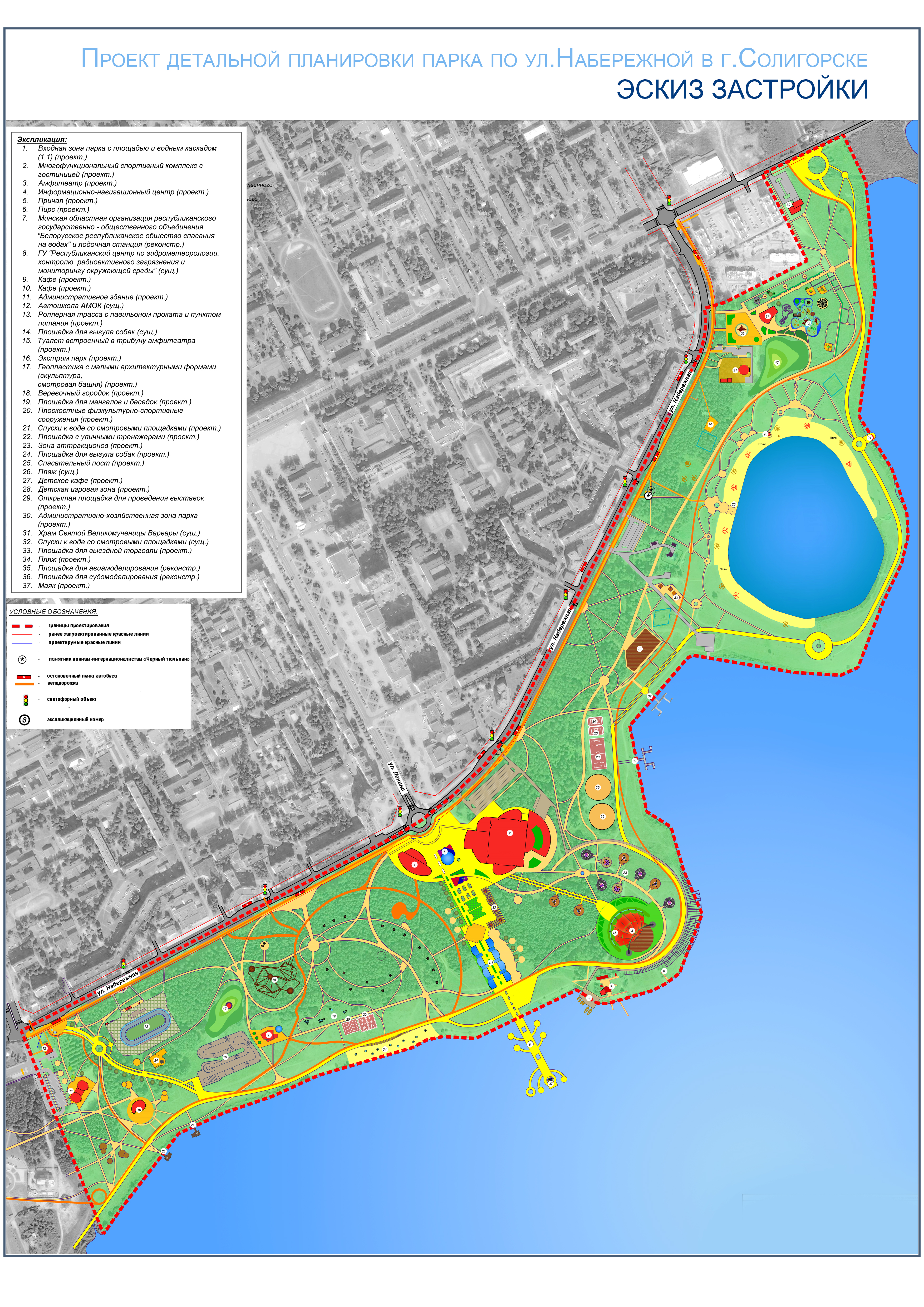 Здесь уже предполагался и многофункциональный спортивный комплекс с гостиницей, экстрим-парк, верёвочный городок, площадка для мангалов и беседок и даже маяк (изображение увеличивается при клике на него):