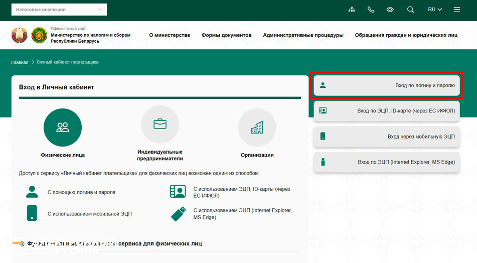 Доступ к сервису "Личный кабинет плательщика" для физических лиц возможен одним из способов: