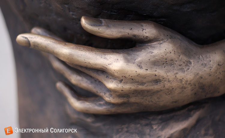 Почти двухметровая скульптура, изображающая близкие к поцелую объятия мужчины и женщины, накануне 55-летия Солигорска была установлена на площадке около Дворца бракосочетаний. Кстати, еще одним изменением в этом месте стал перенос декоративных лавочек, где молодожены оставляют замочки, по правую сторону от входа в ЗАГС. Такой ход только подчеркивает общую концепцию композиции - бронзовая пара словно только что встала со скамеек и, сделав несколько шагов, заключила нежные объятия.