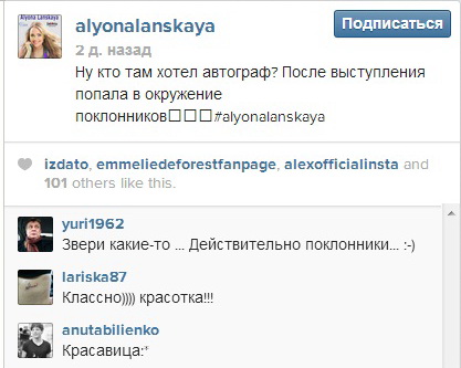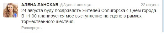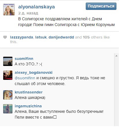 Алена Ланская, недавняя участница Евровидения, также выступала перед солигорской публикой. В подтверждение этому - скрины с ее аккаунтов в твиттере и Instagram.