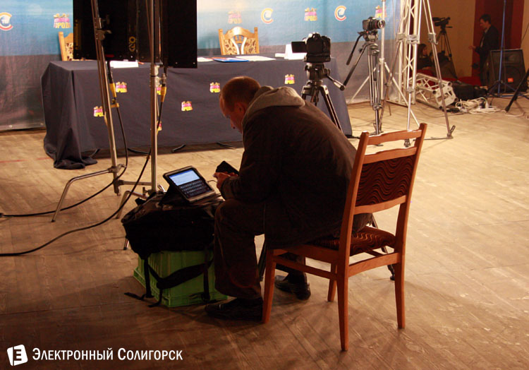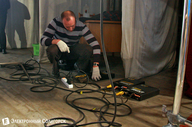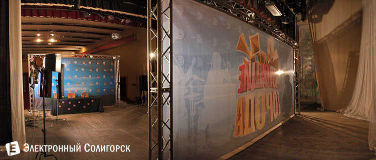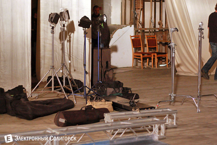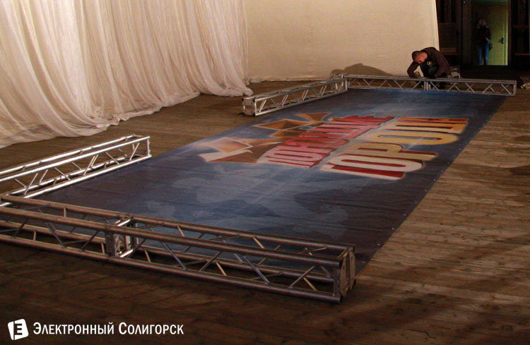 Корреспонденты "Электронного Солигорска", побывав во Дворце культуры на кастинге проекта "Поющие города-2", сделали не только фоторепортаж и видеоролик непосредственно об этом мероприятии, но и обратили свой взор на процесс подготовки сцены и оборудования к его проведению. Стоит вспомнить, что в этот же день точно такой же кастинг проходил в Слуцке. Проходил раньше солигорского и, видимо, поэтому съемочная группа и жюри не поспели к объявленным ранее 17.00. Когда же съемочная площадка начала приобретать более-менее завершенный вид, стало понятно, что на сцене ДК появляется своеобразная комната и зрительному залу не будет видно практически ничего (хотя, там было мало именно зрителей, в основном участники, да и это все-таки телевизионный проект). Выглядело это вот так: