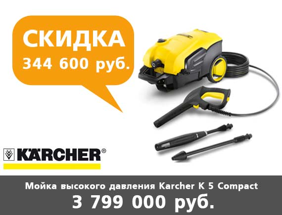 Сеть магазинов садовой техники и электроинструмента «Удачник» объявляет о старте новой уникальной акции! Только с 18 апреля по 18 мая мойку высокого давления Kärcher K 5 Compact можно купить по акционной суперцене – 3 799 000 рублей! Прежняя цена мойки составляла 4 143 600 рублей. Таким образом, совершая покупку во время действия акции, вы экономите 344 600 рублей.