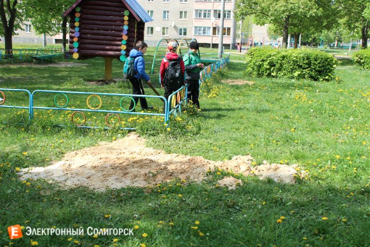 Пока мы разговаривали с Оксаной, к нам подбежали мальчишки, которые гуляли в парке и наперебой стали рассказывать, как в парк "приехала машина и стала сверлить дырки в земле" прямо у их детской площадки. Песок на траве и есть те самые "дырки", такие теперь по всему парку.