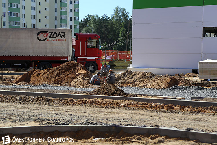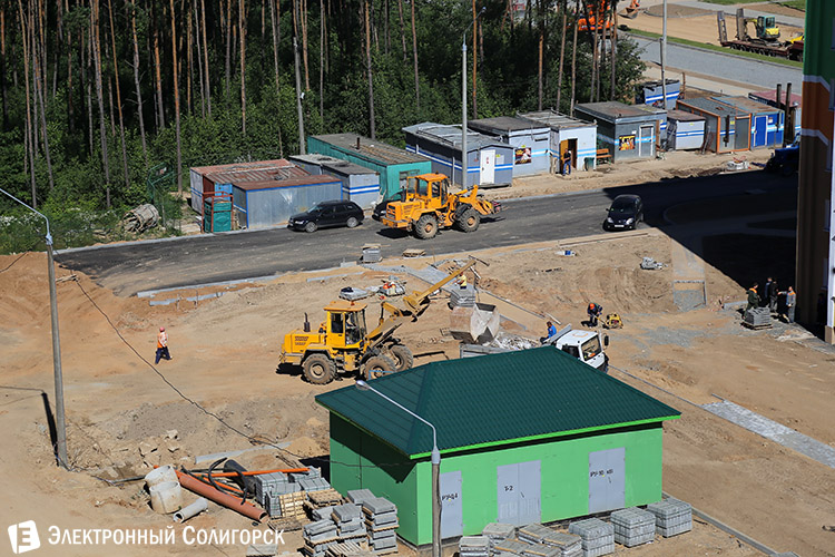 По соседству с этим ярким домом строится еще один знаковый объект - супермаркет "Родная сторона". В течение лета обещают открытие.