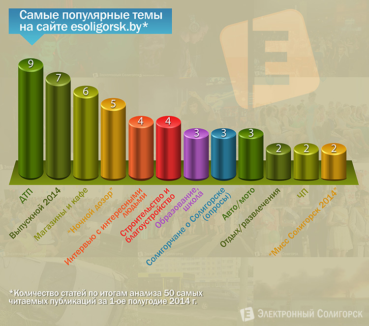 Также мы проанализировали первую полусотню самых читаемых материалов полугодия, чтобы выявить самые востребованные темы. Лидер среди тем - дорожно-транспортные происшествия, 9 материалов о которых фигурирует среди 50 самых посещаемых публикаций. Выпускной бал 7 раз фигурирует в первой полусотне. Статьи, рассказывающие о новостях солигорских кафе и магазинов, встречаются в топе 6 раз, материалы рубрики "Ночной дозор" - 5 раз. Подробнее о тематических предпочтениях - в нашей инфографике.