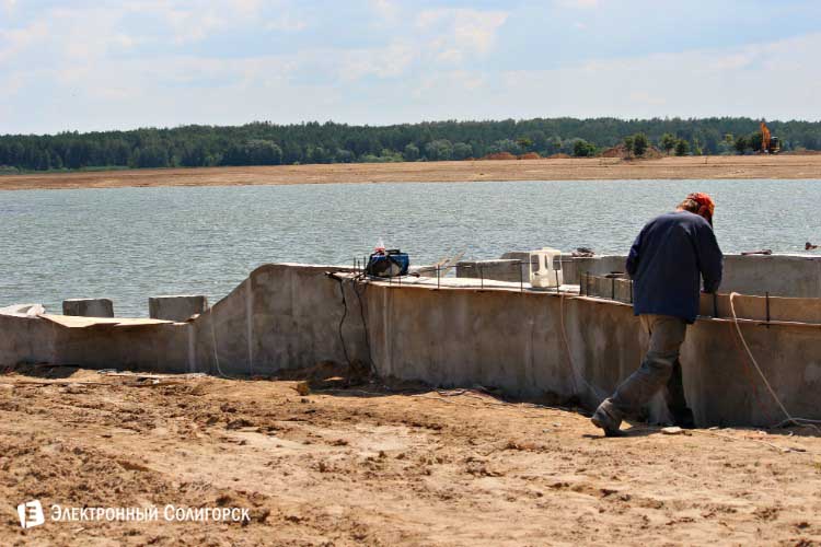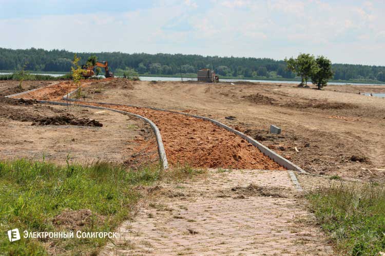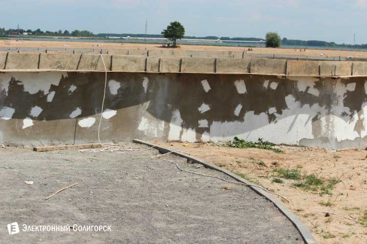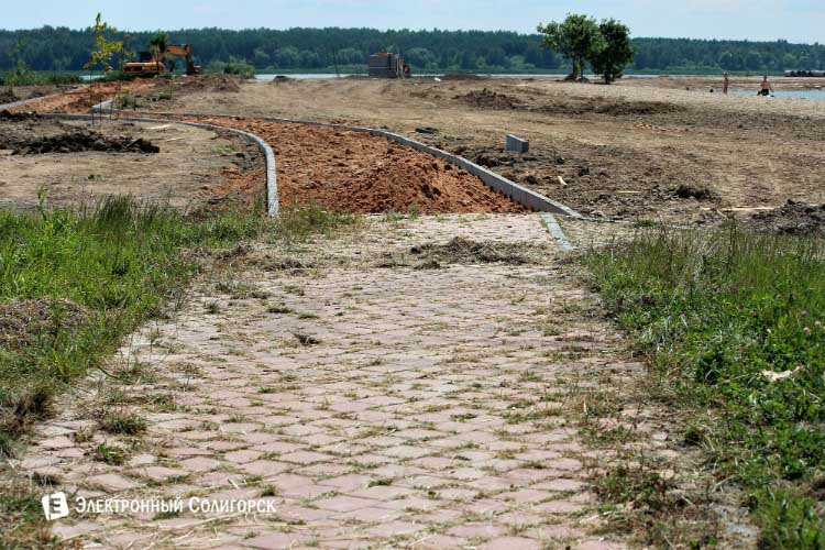 Если до этого времени благоустройство как таковое на детском пляже было только по одну сторону чаши бассейна, то теперь строители занялись наведением порядка на противоположном берегу. Здесь уже начались работы по укладке дорожек тротуарной плиткой.