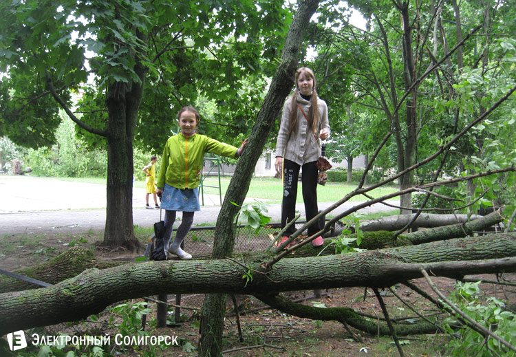 Одно из мест массового падежа больших деревьев - сквер возле Стройтреста №3, а также расположенный поблизости стадион гимназии №1. Значительная часть сквера завалена упавшими деревьями, некоторые из которых повредили скамейки, ограждения, вырвали корнями тротуарную плитку. Прохожим приходится корректировать свой маршрут, переступая или обходя лежащие на дорожках стволы и кроны упавших больших деревьев. Аварийными службами с помощью бензопил ведется ликвидация последствия стихии и расчистка улиц. Детишки облюбовали для игр стволы упавших деревьев, не упускают горожане запечатлеть на фото необычную для повседневности картину.