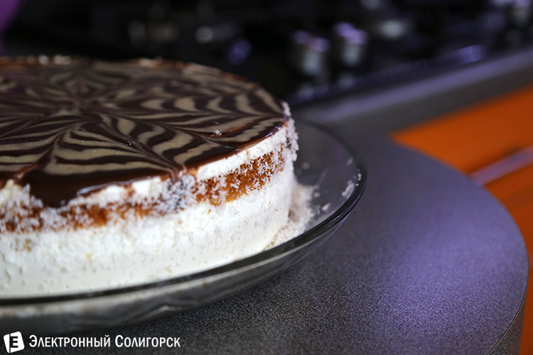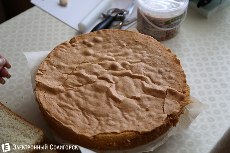 Остывший корж нарезается, и из полученных частей и начинки составляется торт.