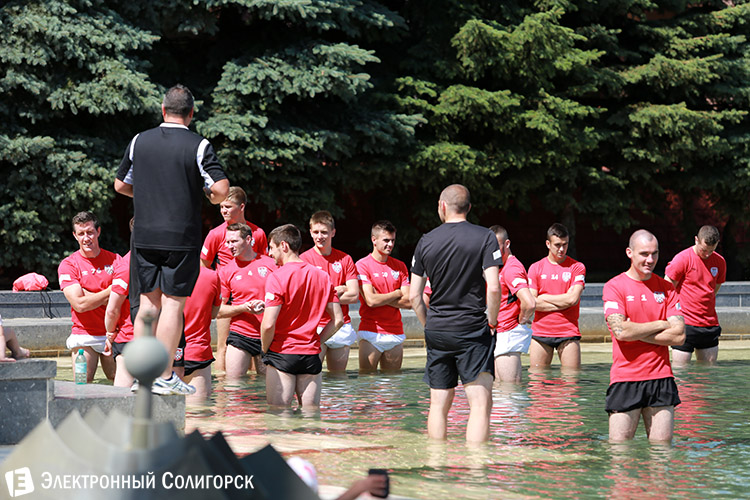 Однако прежде, чем разойтись по номерам все футболисты сняли обувь и... зашли в фонтан, расположенный у здания управления ОАО "Беларуськалий". Под надзором тренеров они стояли в воде несколько минут. Как выяснилось, это была процедура релаксации спортсменов после тренировки в рамках подготовки к матчу с "Шахтером".