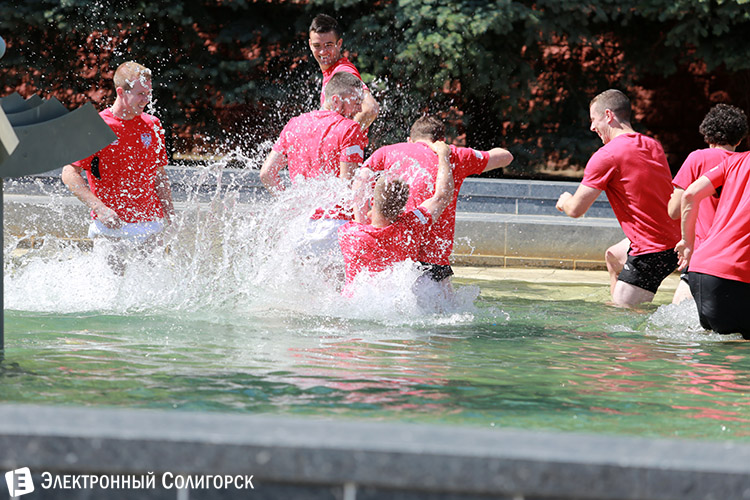 У приезжих футболистов явно было хорошее настроение, потому как вскоре процесс релаксации принял веселый оборот: обливания, брызги, смех... Кое-кому пришлось даже окунуться. Напомним, к слову, что солигорская санстанция не рекомендует купаться в городских фонтанах, где не производится циркуляция воды. Остается надеяться, что здоровью наших гостей после этого купания последствия не грозят:))